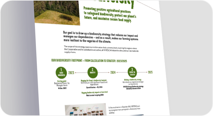 FOSTERING CONNECTIONS Our connection to the Earth Biodiversity Promoting positive agricultural practices to safeguard biodiversity, protect our planet’s future, and maximise secure food supply. Our goal is to draw up a biodiversity strategy that reduces our impact and manages our dependencies – and as a result, makes our farming systems more resilient to the vagaries of the climate. The scope of this strategy spans our entire value chain, at every level, covering the regions where the Cooperative and its subsidiaries are active, all VIVESCIA Industries sites, and our raw materials supply chains. OUR BIODIVERSITY FOOTPRINT – FROM CALCULATION TO STRATEGY: 2023/2025 1 2 3 RAISE 2023 QUANTIFY 2024 DEFINE THE 2025 AWARENESS STRATEGY Starting point Mapping the Group’s biodiversity footprint Defining a biodiversity strategy Biodiversity Fresco, Top Identifying our most significant impacts and that reduces our impacts and manages Managers Forum dependencies our dependencies 14 Dec. 2022 Quantification – H1, 2024 VIVESCIA Group Biodiversity strategy defined by the end of 2024 Mapping biodiversity impacts at farm level Work to start in spring 2024 At the annual seminar in December 2022, VIVESCIA Group’s top management team participated in a Biodiversity Fresco workshop 42