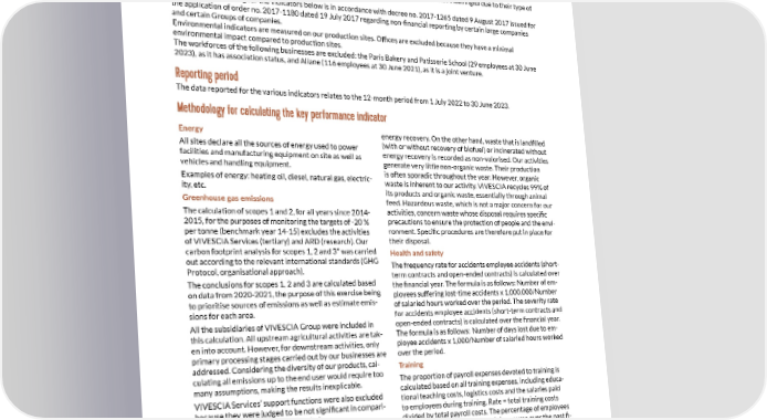 GOING DEEPER METHODOLOGY The scope of reporting used for these indicators is the VIVESCIA Group scope of consolidation. Companies under VIVESCIA’s operational control (> 50%) are included in the scope. Companies in which VIVESCIA holds a minority interest are not included in the scope of this CSR report. Similarly, entities such as property management companies and 昀椀nancial holding companies, where the evaluation of workforce and environmental indicators is not meaningful due to their type of business, are not included. The scope of reporting for the indicators below is in accordance with decree no. 2017-1265 dated 9 August 2017 issued for the application of order no. 2017-1180 dated 19 July 2017 regarding non-昀椀nancial reporting by certain large companies and certain Groups of companies. Environmental indicators are measured on our production sites. Of昀椀ces are excluded because they have a minimal environmental impact compared to production sites. The workforces of the following businesses are excluded: the Paris Bakery and Patisserie School (29 employees at 30 June 2023), as it has association status, and Aliane (116 employees at 30 June 2021), as it is a joint venture. Reporting period The data reported for the various indicators relates to the 12-month period from 1 July 2022 to 30 June 2023. Methodology for calculating the key performance indicator Energy energy recovery. On the other hand, waste that is land昀椀lled (with or without recovery of biofuel) or incinerated without All sites declare all the sources of energy used to power energy recovery is recorded as non-valorised. Our activities facilities and manufacturing equipment on site as well as generate very little non-organic waste. Their production vehicles and handling equipment. is often sporadic throughout the year. However, organic Examples of energy: heating oil, diesel, natural gas, electric- ity, etc. waste is inherent to our activity. VIVESCIA recycles 99% of Greenhouse gas emissions its products and organic waste, essentially through animal feed. Hazardous waste, which is not a major concern for our The calculation of scopes 1 and 2, for all years since 2014- activities, concern waste whose disposal requires speci昀椀c 2015, for the purposes of monitoring the targets of -20 % precautions to ensure the protection of people and the envi- per tonne (benchmark year 14-15) excludes the activities ronment. Speci昀椀c procedures are therefore put in place for their disposal. of VIVESCIA Services (tertiary) and ARD (research). Our carbon footprint analysis for scopes 1, 2 and 3* was carried Health and safety out according to the relevant international standards (GHG Protocol, organisational approach). The frequency rate for accidents employee accidents (short- term contracts and open-ended contracts) is calculated over The conclusions for scopes 1, 2 and 3 are calculated based the 昀椀nancial year. The formula is as follows: Number of em- on data from 2020-2021, the purpose of this exercise being ployees suffering lost-time accidents x 1,000,000/Number to prioritise sources of emissions as well as estimate emis- of salaried hours worked over the period. The severity rate sions for each area. for accidents employee accidents (short-term contracts and open-ended contracts) is calculated over the 昀椀nancial year. All the subsidiaries of VIVESCIA Group were included in this calculation. All upstream agricultural activities are tak- The formula is as follows: Number of days lost due to em- en into account. However, for downstream activities, only ployee accidents x 1,000/Number of salaried hours worked primary processing stages carried out by our businesses are over the period. addressed. Considering the diversity of our products, cal- Training culating all emissions up to the end user would require too The proportion of payroll expenses devoted to training is many assumptions, making the results inexplicable. calculated based on all training expenses, including educa- VIVESCIA Services’ support functions were also excluded tional teaching costs, logistics costs and the salaries paid because they were judged to be not signi昀椀cant in compari- to employees during training. Rate = total training costs son to VIVESCIA Group’s total emissions. divided by total payroll costs. The percentage of employees Waste having followed at least one training course over the past 昀椀- Non-organic waste recorded include metal, paper, card- nancial year is calculated based on the number of employees board, plastic, glass, wood/pallets and non-hazardous indus- (contracted on the 昀椀nal day of the 昀椀nancial year) having fol- trial waste. Waste was recorded by weight. Recycled and lowed at least one training course during the previous year non-recycled waste are differentiated. We consider waste out of the total number of employees as at 30 June 2023. to be “valorised” when there is recycling or incineration with *Scope 1 represents the GHG emissions produced directly by the company, scope 2 refers to indirect emissions related to energy not directly generated on the company’s premises, and 昀椀nally, scope 3 is related to indirect emissions that are not under the company’s control. 80