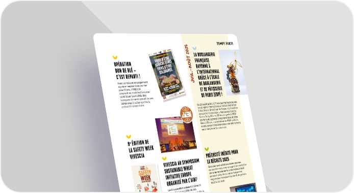 TE m P s FOR ts j UIL .-ao T 2025 OPRATION DON DE BL CEST REPARTI ! Avec un nouvel engagement sign en septembre dernier pour 3 ans, VIVESCIA poursuit sa mobilisation pour contribuer aux cts des banques alimentaires et de ses bnvoles lutter contre la prcarit alimentaire. TE m P s FOR ts GENOPOLE ET ARD SALLIENT POUR ACCLRER LINDUSTRIALISATION DES BIOTECHNOLOGIES EN FRANCE Un partenariat stratgique pour proposer une offre commune daccompagnement aux acteurs de la bioconomie, aux industriels, aux start up biotech et aux laboratoires acadmiques dans le seul objectif de soutenir lmergence dune filire franaise souveraine et comptitive. LA BOULANGERIE FRANAISE RAYONNE LINTERNATIONAL GRCE LCOLE DE BOULANGERIE ET DE PTISSERIE DE PARIS (EBP) ! 9 e DITION DE LA SAFETY WEEK VIVESCIA VIVESCIA AU SYMPOSIUM SUSTAINABLE WHEAT INITIATIVE EUROPE ORGANIS PAR LAIBI 1 Le Groupe tait prsent Utrecht (Pays Bas) aux cts de ses entreprises Grands Moulins de Paris et Dlifrance pour prsenter le programme TRANSITIONS et soutenir la Sustainable Wheat Initiative et son manifeste qui pose des ambitions et les bases dun cosystme partenarial pour une filire bl farine pain bas carbone et plus durable en Europe dici 2030. DU 1 ER JUIN AU 30 SEPTEMBRE 2025 OPRATION DON DE BL REJOIGNEZ LE COLLECTIF VIVESCIA SOLIDAIRE EN OFFRANT VOTRE BL SOLIDAIRES FIERS DTRE FIERS DTRE AGRICULTEURS TONNE DE BL 1 KG DE FARINE 750 POUR FAIRE UN DON, FLASHEZ Formulaire disponible sur En savoir plus : [email protected] C M J CM MJ CJ CMJ N VIVESCIA_AFFICHES_DON ble_agri_exe copie.pdf 1 20/05/2025 06:59 JE PRENDS EN COMPTE LA SCURIT DANS MES DCISIONS + + = SAFETY WEEK 2 > 6 JUIN 2025 ET RETROUVONS-NOUS AUTOUR DUN JEU EN QUIPE Plus dinformations sur MyVIVESCIA #WeCareVIVESCIA LA CULTURE JUSTE DPLOIEMENT DE LA LINK SCHOOL POUR TOUS COLLABORATEURS Une formation e learning accessible dsormais lensemble des collaborateurs du Groupe pour les sensibiliser aux ressorts scientifiques de la transition durable, aux interactions climat/biodiversit/ ressources naturelles et leur impact sur nos socits et pour les inciter agir au sein de leur entreprise comme dans leur propre vie. Du 21 au 24 juillet, la finale des Meilleurs jeunes boulangers internationaux (MJBI) sest tenue Sao Paulo (Brsil) sur le thme La tradition rencontre linnovation . Nos jeunes talents, Sacha Sully, 20 ans, BP boulangerie lEBP de Paris et apprenti chez Pleincur, et Tom Nesci, 23 ans, ancien lve de lEBP de Paris et boulanger chez Pleincur, ont dcroch la seconde place du concours. PRCOCIT INDITE POUR LA RCOLTE 2025 Globalement satisfaisante en termes de qualit mais avec une grande variabilit dans les rendements. Une moisson tout en contraste, donc, o les moyennes rgionales masquent souvent de grands carts au local. 1. AIBI : International Association of Plant Bakers. 57