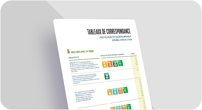 TABLEAUX DE CORRESPONDANCE AV e C LE s ob JECTIF s DE D v ELOP pe ME n T D u RAB le ( odd ) DE L' onu E N G A G E M E N T S O B J E C T I F S D V E L O P P E M E N T D U R A B L E C I B L E S Rduire de 29 % nos missions globales de GES (scopes 1, 2 et 3), dont une rduction de 42 % sur notre primtre de responsabilit directe (scopes 1 et 2) dici 2030, pour contribuer la neutralit carbone horizon 2050 (annes de rfrence 2020-2021) 7.2 7.3 9.4 13.1 15.2 valuer les impacts du changement climatique sur les cultures du territoire de la Cooprative et dans nos zones dapprovisionnement en France et linternational, et laborer des plans dadaptation 13.1 tre moteurs et force de proposition auprs des agriculteurs-cooprateurs VIVESCIA dans les transitions agrocologiques, bas carbone et dans la prservation des sols programme TRANSITIONS 2.4 2.5 6.3 6.4 6.6 12.2 15.1 15.3 15.5 15.8 valuer notre empreinte biodiversit et viser un impact positif au travers de pratiques agricoles et industrielles vertueuses 2.5 6.6 12.2 15.1 15.3 15.5 Btir une vision consolide des enjeux relatifs leau : valuation des impacts et des dpendances et dfinition des orientations stratgiques dattnuation et de rsilience 6.3 6.4 6.6 17.14 Promouvoir et garantir le respect de la Charte environnementale Groupe sur tous nos sites 6.3 6.4 7.1 7.2 7.3 8.4 9.4 12.3 12.5 Minimiser lempreinte environnementale de nos emballages en misant sur lcoconception et le dveloppement du recyclage 12.3 12.5 NO s LI ens AV e C L a TERRE 74