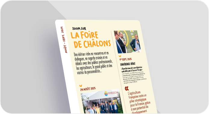 zOO m s UR CONFRENCE-DBAT Une dition riche en rencontres et en dialogues, en regards croiss et en dbats avec des publics professionnels, les agriculteurs, le grand public et des visites de personnalits... l A FOIRE DE CHLO ns A O T - s EP t. 2025 Nouvelle donne de la mondialisation : quels dfis pour la France et lEurope avec Christian Saint tienne, conomiste, universitaire et analyste politique.Squence suivie par un regard crois de Gautier Le Molgat, directeur dArgus Media France, et de Romain Herbelet, directeur commerce des grains chez VIVESCIA. 1 E r s EP t . 2025 29 ao T 2025 INAUGURATION DU VILLAGE VIVESCIA Passage offiiciel du Premier ministre, des ministres de lAgriculture, du Travail et de la Sant. 30 ao T 2025 Rencontre et dialogue entre les Jeunes Agriculteurs du Grand Est et les lus de la Cooprative Lagriculture franaise reste un pilier stratgique pour la France, grce son potentiel de dveloppement de filires industrielles dans lagroalimentaire et lnergie et grce son rle dans la lutte contre le changement climatique. CHRI s TIAN sa I n T-TI en NE conomiste, universitaire et analyste politique 58