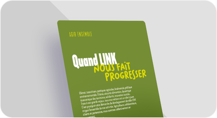 AGIR ENSEMBLE Quand LINK nous FAI t pr OG r E ss E r P a R ti E Climat, transitions, pratiques agricoles, biodiversit, politique environnementale, filires, scurit alimentaire, dynamique conomique des territoires, solidarit, innovation sociale... Face ces grands enjeux, tous nos mtiers ont un rle jouer. Cest pourquoi notre dmarche de dveloppement durable LINK irrigue lensemble de nos activits. Agriculteurs, collaborateurs, clients et partenaires, nous sommes collectivement en mouvement. Et nous progressons ! 03 29