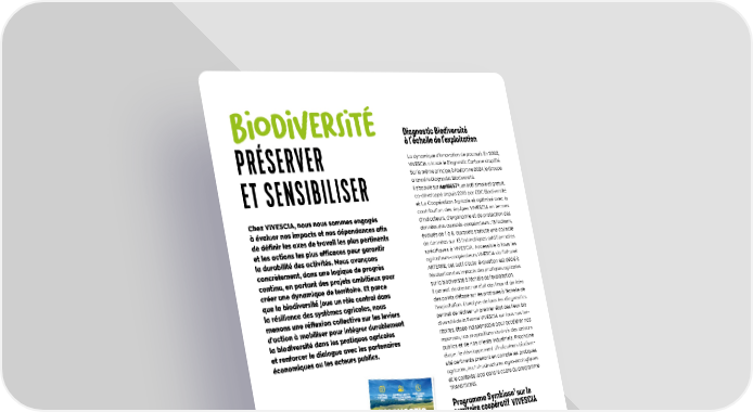 B IO di VE rs I t PRSERVER ET SENSIBILISER Chez VIVESCIA, nous nous sommes engags valuer nos impacts et nos dpendances afin de dfinir les axes de travail les plus pertinents et les actions les plus efficaces pour garantir la durabilit des activits. Nous avanons concrtement, dans une logique de progrs continu, en portant des projets ambitieux pour crer une dynamique de territoire. Et parce que la biodiversit joue un rle central dans la rsilience des systmes agricoles, nous menons une rflexion collective sur les leviers daction mobiliser pour intgrer durablement la biodiversit dans les pratiques agricoles et renforcer le dialogue avec les partenaires conomiques ou les acteurs publics. Diagnostic Biodiversit lchelle de lexploitation La dynamique dinnovation de poursuit. En 2022, VIVESCIA a lanc le Diagnostic Carbone simplifi. Sur le mme principe, lautomne 2024, le Groupe a lanc le Diagnostic Biodiversit. Il sappuie sur AgriBEST , un outil simple et gratuit, co dvelopp depuis 2019 par CDC Biodiversit et La Coopration Agricole et optimis avec la contribution des quipes VIVESCIA en termes dindicateurs, dergonomie et de protection des donnes des associs cooprateurs : 15 facteurs, valus de 1 5, auxquels sajoute une collecte de donnes sur 13 thmatiques additionnelles spcifiques VIVESCIA. Accessible tous les agriculteurs cooprateurs VIVESCIA via lintranet ARTERRE, cet outil dauto valuation est ddi lvaluation des impacts des pratiques agricoles sur la biodiversit lchelle de lexploitation. Il permet de dresser un tat des lieux et de faire des points dtape sur les pratiques lchelle de lexploitation. Lanalyse de tous les diagnostics permet de raliser un premier tat des lieux bio diversit de la Ferme VIVESCIA sur tous nos ter ritoires, tape indispensable pour acclrer nos rponses, nos propositions vis vis des acteurs publics et de nos clients industriels. Prochaine tape : le dveloppement dindicateurs biodiver sit pertinents prenant en compte les pratiques agricoles, les infrastructures agro cologiques et le contexte local dans le cadre du programme TRANSITIONS. Programme Symbiose 1 sur le territoire coopratif VIVESCIA Le partenariat avec l'association pour la biodiver sit Symbiose, la Cooprative et nos mtiers de transformation (Malteurop, Dlifrance et Grands Moulins de Paris) se poursuit. Les entreprises de VIVESCIA Industries financent 3 projets robustes de prservation des cosystmes des territoires de la Cooprative. Ces 3 projets trames bleues et trames vertes sont inscrits dans la dure, avec un plan dactions, un budget prvisionnel sur 5 ans et des indicateurs de suivi. Ils se sont poursuivis durant lexercice 24/25. Cette initiative contribue aussi renforcer les liens au sein du Groupe et son ancrage agri cole local. 1. Lassociation Symbiose, pour des paysages de biodiversit rassemble les acteurs de la rgion Champagne-Ardenne engags pour la gestion de la biodiversit. + de 500 diagnostics dj raliss dont 95% agriculteurs TRANSITIONS 94 000 ha concerns Prs de 40