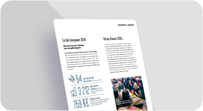 Vision davenir 2030... Comment continuer conjuguer proximit, qualit de service et meilleure efficience lhorizon 2030 ? La question a fait lobjet dune rflexion mene tout au long de lexercice 2024 2025, dans une dmarche rsolument collaborative. Un processus dcoute et de co construction qui sest droul selon trois phases : une large consultation de lensemble des parties prenantes (associs cooprateurs, clients industriels, partenaires) pour amorcer la rflexion et alimenter, dans un second temps, des ateliers de co construction avec lensemble des collaborateurs de la Cooprative sur des thmatiques prcises, avant une dernire phase de structuration et de consolidation du plan stratgique et oprationnel des mtiers agricoles. Le dfi, cest de rester coopratif dans un monde o on nous encourage des pratiques individuelles, chercher les solutions par nous-mmes. F a BIE n W a RZEE Agriculteur-cooprateur Artaise-le-Vivier (08) 9 mois dcoute, de rflexion et de co-production avec les collaborateurs Je souhaite que la Cooprative continue clairer le chemin, anticiper et nous accompagner sur les transitions ncessaires, nous reprsenter auprs des grandes instances de dcision et contribuer inflchir, si besoin, des orientations politiques qui nous seraient dfavorables. MICHAL DI d I o T Agriculteur-cooprateur Cond-en-Barrois (55) Atelier de rflexion lors des vux de la Cooprative, le 16 janvier 2025 Lpine (51). A n TICIPE r & inn O v ER Le fait marquant 2024 Une rcolte en retrait historique avec une qualit dgrade Le travail et la conservation du grain, un savoir-faire cl. Les quipes terrain du ple agricole ont mobilis leur expertise pour sadapter aux attentes des agriculteurs (plage horaire largie pour les silos, seuil dhumidit des grains remont...) et pour prserver la qualit des grains, trier et alloter afin de composer des assemblages homognes conformes aux attentes des marchs. agriculteurs- stockeurs, soit 30 % du grain collect stocks la ferme 3 212 jours de priode de moisson vs 38 jours en 2023 54 daides verses 146 nouveaux associs-cooprateurs et jeunes agriculteurs (du 1 er juillet 2024 au 30 juin 2025) 759 K Atelier de rflexion lors des vux de la Cooprative, le 8 janvier 2025 Saint-Mesmin (10). 25