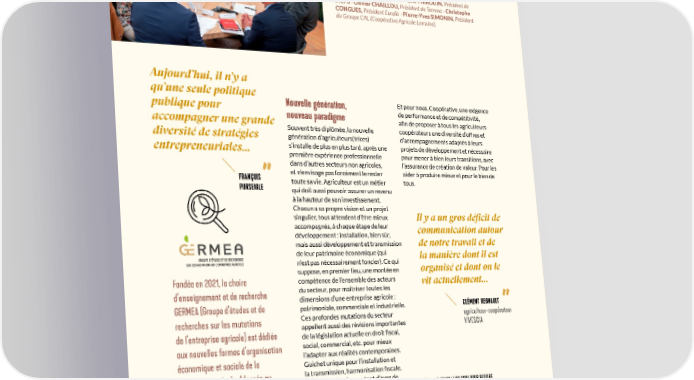 CE QUI NOUS LIE TABLE RONDE 2 : LES POLITIQUES PUBLIQUES ET LE RÔLE DES COOPÉRATIVES POUR ACCOMPAGNER AU MIEUX LES MUTATIONS DES MODÈLES D’ORGANISATION AGRICOLE. Avec François PURSEIGLE, sociologue à l’Agro Toulouse INP- ENSAT et auteur du livre «Une agriculture sans agriculteurs» - Geneviève NGUYEN, agroéconomiste à l’Agro Toulouse INP-ENSAT - Frédéric DESCROZAILLE, député du Val-de- Marne - Éric GIRARDIN, député de la Marne - Christoph BÜREN, Président de VIVESCIA - Éric THIROUIN, Président de l’AGPB - Olivier CHAILLOU, Président de Terrena - Christophe CONGUES, Président Euralis - Pierre-Yves SIMONIN, Président du Groupe CAL (Coopérative Agricole Lorraine). Aujourd’hui, il n’y a qu’une seule politique publique pour Nouvelle génération, Et pour nous, Coopérative, une exigence nouveau paradigme de performance et de compétitivité, accompagner une grande a昀椀n de proposer à tous les agriculteurs- diversité de stratégies Souvent très diplômée, la nouvelle coopérateurs une diversité d’offres et d’accompagnements adaptés à leurs génération d’agriculteurs(trices) entrepreneuriales... s’installe de plus en plus tard, après une projets de développement et nécessaire pour mener à bien leurs transitions, avec première expérience professionnelle dans d’autres secteurs non agricoles, l’assurance de création de valeur. Pour les aider à produire mieux et pour le bien de FRANÇOIS et n’envisage pas forcément le rester tous. PURSEIGLE toute sa vie. Agriculteur est un métier qui doit aussi pouvoir assurer un revenu à la hauteur de son investissement. Chacun a sa propre vision et un projet singulier, tous attendent d’être mieux Il y a un gros déficit de accompagnés, à chaque étape de leur communication autour développement : installation, bien sûr, mais aussi développement et transmission de notre travail et de de leur patrimoine économique (qui la manière dont il est n’est pas nécessairement foncier). Ce qui organisé et dont on le suppose, en premier lieu, une montée en Fondée en 2021, la chaire compétence de l’ensemble des acteurs vit actuellement... d’enseignement et de recherche du secteur, pour maîtriser toutes les dimensions d’une entreprise agricole : GERMEA (Groupe d’études et de patrimoniale, commerciale et industrielle. CLÉMENT REGNAULT recherches sur les mutations Ces profondes mutations du secteur agriculteur-coopérateur de l’entreprise agricole) est dédiée appellent aussi des révisions importantes VIVESCIA de la législation actuelle en droit 昀椀scal, aux nouvelles formes d’organisation social, commercial, etc. pour mieux économique et sociale de la l’adapter aux réalités contemporaines. Guichet unique pour l’installation et production agricole. Adossée au la transmission, harmonisation 昀椀scale, fonds de dotation de l’Université portage du foncier... autant d’axes de FLASHEZ LE QR CODE POUR REVIVRE travail que les pouvoirs publics auront à LA JOURNÉE DU 4 SEPTEMBRE fédérale Toulouse Midi-Pyrénées, examiner demain. Autre enjeu : apprendre ET LES 2 TABLES RONDES elle est portée par Toulouse à mieux communiquer sur ce que le monde agricole fait déjà pour répondre INP-ENSAT avec le soutien de trois aux nombreuses injonctions, de la mécènes : les groupes coopératifs souveraineté alimentaire à la nécessaire préservation de la biodiversité et à la VIVESCIA, Euralis et Terrena. réduction de l’impact carbone. 22