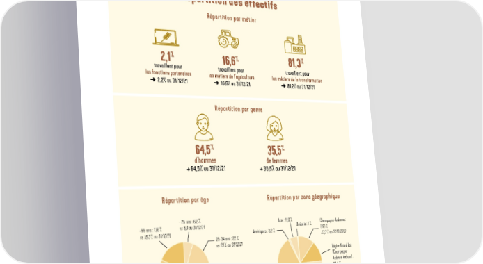 POUR ALLER PLUS LOIN E昀昀ec琀椀f L’effectif du Groupe VIVESCIA prend en compte les salariés (CDI et CDD) présents au dernier jour de la période, soit au 30 juin 2023. Répartition des effectifs Répartition par métier 2,1% 16,6% 81,3% travaillent pour travaillent pour travaillent pour les fonctions partenaires les métiers de l’agriculture les métiers de la transformation ➜ 2,2% au 31/12/21 ➜ 16,6% au 31/12/21 ➜ 81,2% au 31/12/21 Répartition par genre % % 64,5 35,5 d’hommes de femmes ➜ 64,5% au 31/12/21 ➜ 35,5% au 31/12/21 Répartition par âge Répartition par zone géographique - 25 ans : 6,2 % Asie : 11,6 % Champagne-Ardenne : +55 ans : 17,6 % vs 5,8 au 31/12/21 Océanie : 1 % 26,1 % vs 15,3 % au 31/12/21 Amériques : 3,2 % 23,3 % au 31/12/2021 25-34 ans : 22 % vs 23 % au 31/12/21 Région Grand Est (Champagne- Ardenne incluse) : 26,4 % Europe 45-54 ans : 26,5 % (France incluse) : France (région vs 27,7 % au 31/12/21 35-44 ans : 27,7 % 84,2 % Grand Est incluse) : vs 28,2 % au 61,2 % 31/12/21 81