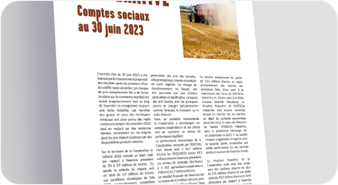 POUR ALLER PLUS LOIN COOPÉRATIVE Comptes sociaux au 30 juin 2023 Le résultat exceptionnel est positif généralisée des prix des céréales, L’exercice clos au 30 juin 2023 a été de 13,3 millions d’euros, en raison marqué par le retournement progressif oléoprotéagineux, engrais et produits principalement des reprises des des marchés après les premiers effets de santé végétale. Les charges de fonctionnement, en hausse, ont provisions liées, d’une part, à la du con昀氀it russo-ukrainien. Les niveaux valorisation des titres de VIVESCIA été percutées par une in昀氀ation de prix exceptionnels liés à de fortes Industries et, d’autre part, à sa 昀椀liale tensions sur le commerce mondial ont généralisée et signi昀椀cative. La hausse Compas (activité viticulture). La des prix touche ainsi les principaux baissé progressivement tout au long postes de charges opérationnelles situation 昀椀nancière de VIVESCIA de l’exercice en enregistrant toujours comme l’énergie, le transport ou la Industries s’est encore renforcée une forte volatilité. Les marchés des grains et celui des fertilisants main-d’œuvre. durant cet exercice sur ses marchés en dépit du contexte économique Dans ce contexte mouvementé, minéraux ont ainsi connu des replis perturbé. Ainsi, la valeur de référence la Coopérative a accompagné ses continus à compter de novembre 2022 de l’action VIVESCIA Industries, tout en restant sur des moyennes associés-coopérateurs et ses clients pour la plateforme d’échange, est a昀椀n de maintenir un niveau de élevées, notamment sur les engrais, performance équilibré. en progression à 26,95 €. La société dont les prix étaient soutenus par des disponibilités produits réduites. La performance économique de la Compas a également enregistré pour la seconde année consécutive une Coopérative, mesurée par l’EBITDA, solide performance sur ses marchés s’est élevée ainsi à 26,7 millions Sur le territoire de la Coopérative, la porteurs au cours de l’exercice écoulé. d’euros sur 2022/2023 contre 19,3 collecte 2022 connaît un léger repli millions d’euros l’exercice précédent. par rapport à l’exercice précédent Les primes de stockage, distribuées La structure 昀椀nancière de la de 5% à 2,9 millions de tonnes. S’y Coopérative reste ainsi très solide à 3 312 agriculteurs-coopérateurs, ajoute la collecte du négoce, soit avec des capitaux propres de plus s’élèvent à 6,7 millions d’euros. un total de 3,3 millions de tonnes. de 379 millions d’euros et une dette Les conditions climatiques de l’été Le résultat 昀椀nancier de l’exercice est nette de 10,2 millions d’euros en forte en baisse de 6,3 millions d’euros, pour 2022 particulièrement ensoleillées diminution par rapport à l’exercice caractérisent cette moisson précoce s’établir à - 5,7 millions d’euros. Dans précédent en raison de l’allégement du le sillage de l’in昀氀ation, la hausse des qui s’est exécutée dans de bonnes poids des stocks de grains et d’engrais conditions sanitaires et logistiques. taux d’intérêt caractérise également au 30 juin 2023. cet exercice clos au 30 juin 2023 qui a vu l’Euribor passer de - 0,50 % début Ainsi, le chiffre d’affaires de la juillet 22 à 3,40 % en juin 2023. La Coopérative s’élève à 1 536 millions Coopérative a ainsi porté une activité d’euros en progression de 25 % mobilisant plus de capitaux dans des par rapport à l’exercice passé, essentiellement porté par la hausse conditions tarifaires en forte hausse. 66