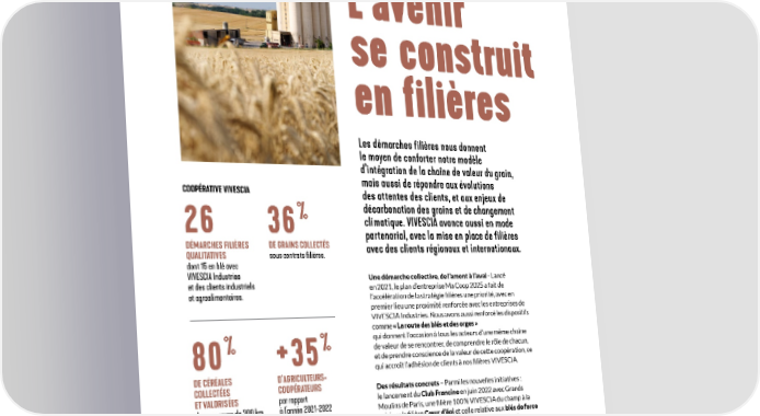 Nos liens avec nos filières & territoires L’avenir se construit en filières Les démarches filières nous donnent le moyen de conforter notre modèle d’intégration de la chaîne de valeur du grain, mais aussi de répondre aux évolutions COOPÉRATIVE VIVESCIA des attentes des clients, et aux enjeux de % décarbonation des grains et de changement 26 36 climatique. VIVESCIA avance aussi en mode partenarial, avec la mise en place de filières DÉMARCHES FILIÈRES DE GRAINS COLLECTÉS avec des clients régionaux et internationaux. QUALITATIVES sous contrats filières. dont 15 en blé avec VIVESCIA Industries Une démarche collective, de l’amont à l’aval - Lancé et des clients industriels et agroalimentaires. en 2021, le plan d’entreprise Ma Coop 2025 a fait de l’accélération de la stratégie 昀椀lières une priorité, avec en premier lieu une proximité renforcée avec les entreprises de VIVESCIA Industries. Nous avons aussi renforcé les dispositifs comme « La route des blés et des orges » % % qui donnent l’occasion à tous les acteurs d’une même chaîne de valeur de se rencontrer, de comprendre le rôle de chacun, 80 +35 et de prendre conscience de la valeur de cette coopération, ce DE CÉRÉALES D'AGRICULTEURS- qui accroît l’adhésion de clients à nos 昀椀lières VIVESCIA. COLLECTÉES COOPÉRATEURS Des résultats concrets – Parmi les nouvelles initiatives : ET VALORISÉES par rapport le lancement du Club Francine en juin 2022 avec Grands dans un rayon de 300 km à l'année 2021-2022 du territoire coopératif. certifiés CE2*, soit 346 Moulins de Paris, une 昀椀lière 100 % VIVESCIA du champ à la cuisine ; la 昀椀lière Cœur d’épi et celle relative aux blés de force et 150 en HVE.** pour accompagner les besoins des clients (viennoiseries, petits buns ou brioches). Des partenariats renforcés ont aussi vu le jour avec des acteurs de l’agroalimentaire ou avec des * Certi昀椀cation environnementale niveau 2. ** Haute valeur environnementale. moulins régionaux comme la 昀椀lière Signy-l’Abbaye. 46