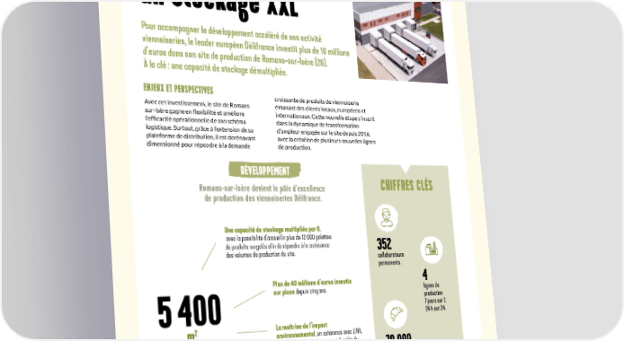 PANORAMA ZOOM SUR… 16 mai 2023 Romans-sur-Isère : un stockage XXL Pour accompagner le développement accéléré de son activité viennoiseries, le leader européen Délifrance investit plus de 10 millions d’euros dans son site de production de Romans-sur-Isère (26). À la clé : une capacité de stockage démultipliée. ENJEUX ET PERSPECTIVES croissante de produits de viennoiserie Avec cet investissement, le site de Romans- émanant des clients locaux, européens et sur-Isère gagne en 昀氀exibilité et améliore internationaux. Cette nouvelle étape s’inscrit l’ef昀椀cacité opérationnelle de son schéma dans la dynamique de transformation d’ampleur engagée sur le site depuis 2016, logistique. Surtout, grâce à l’extension de sa plateforme de distribution, il est dorénavant avec la création de plusieurs nouvelles lignes dimensionné pour répondre à la demande de production. DÉVELOPPEMENT Romans-sur-Isère devient le pôle d’excellence CHIFFRES CLÉS de production des viennoiseries Délifrance. Une capacité de stockage multipliée par 6, avec la possibilité d’accueillir plus de 12 000 palettes de produits surgelés afin de répondre à la croissance 352 des volumes de production du site. collaborateurs permanents. Plus de 40 millions d’euros investis 4 sur place depuis cinq ans. lignes de production 7 jours sur 7, 5 400 24 h sur 24. 2 La maîtrise de l’impact m environnemental, en cohérence avec LINK, la démarche de développement durable du 78 000 Groupe VIVESCIA, et Baking Good BETTER, la stratégie RSE engagée par notre entreprise. tonnes de capacité de production par an. Des économies d’énergie grâce à l’optimisation des flux, évitant les trajets inutiles, et le choix d’équipements industriels + de 58 innovants, améliorant la gestion des sources de pays livrés. chaleur sur les installations de froid. 57