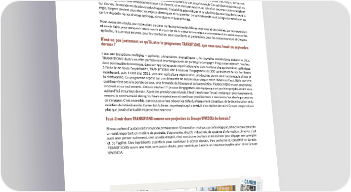 REGARD DE CHRISTOPH BÜREN La transformation est bel et bien engagée et doit se traduire demain par encore plus de performance et de création de valeur pour le périmètre de nos activités de VIVESCIA Industries. Olivier Miaux et ses directeurs opérationnels ont leur feuille de route bien en main et ont engagé des ré昀氀exions stratégiques en vue d’ouvrir un nouveau chapitre. Nouveau chapitre pour VIVESCIA Industries, dites-vous, et plus globalement pour le Groupe ? C’est effectivement notre 昀椀l rouge depuis quelques mois et notre agenda de 2024. Penser nos futurs, écrire nos trajectoires, bâtir VIVESCIA 2030, c’est une responsabilité collective que je porte avec le Conseil d’administration et les équipes dirigeantes. Une ré昀氀exion holistique qui s’inscrit, et ce n’est pas neutre, au sein d’un nouveau cycle stratégique qui s’ouvre : le monde est de plus en plus fragmenté, l’instabilité géopolitique et la volatilité des marchés deviennent la règle, l’argent devient plus cher, les enjeux climatiques et la question de la biodiversité sont à l’agenda mondial et au centre des dé昀椀s de nos chaînes agricoles, alimentaires et énergétiques. Nous avons des atouts, par notre place au cœur de l’écosystème des 昀椀lières végétales et céréalières, par nos expertises et savoir-faire, pour conquérir notre avenir et apporter de la valeur économique, environnementale, sociétale pour les agriculteurs que nous servons, pour les territoires, pour nos clients et partenaires, pour les consommateurs et citoyens. N’est-ce pas justement ce qu’illustre le programme TRANSITIONS, que vous avez lancé en septembre dernier ? Face aux transitions multiples – agricoles, alimentaires, énergétiques –, de nouvelles coopérations doivent se bâtir. TRANSITIONS illustre en effet parfaitement les changements de paradigme à engager. Programme pionnier, novateur dans son modèle économique, dans son approche socio-organisationnelle, dans sa démarche agronomique systémique à l’échelle de toute l’exploitation, TRANSITIONS vise à soutenir l’engagement de 200 agriculteurs de nos territoires maintenant, puis 1 000 d’ici 2026, vers une agriculture régénérative, productive, bonne pour la planète, le climat et la biodiversité. Ce programme repose sur une démarche de coopération unique entre l’amont et l’aval. Bâtir une telle coalition n’est pas à la portée de tous, cela demande de l’énergie et de la conviction. TRANSITIONS est un programme innovant et surtout concret. J’en suis très 昀椀er ! Et je salue l’engagement des équipes qui ont porté ce projet et le font vivre aujourd’hui et surtout demain. Après des premiers pas réussis, il faut transformer l’essai : embarquer plus massivement, encore, la communauté des agriculteurs-coopérateurs et continuer parallèlement à convaincre nos clients partenaires de s’engager. C’est ensemble, que nous pourrons relever les dé昀椀s du changement climatique, de la décarbonation et du maintien de la biodiversité. L’union fait la force : ce précepte, qui a conduit à la création de notre Groupe coopératif, est plus que jamais d’actualité et prend tout son sens ! Faut-il voir dans TRANSITIONS comme une projection du Groupe VIVESCIA de demain ? Si nous parlons d’audace et d’innovation, certainement ! L’innovation n’est pas que technologique, même si cela représente un volet important en matière de produits, d’agronomie, d’outils industriels, de système d’information… Innover, c’est aussi oser penser autrement, c’est un état d’esprit, c’est construire des liens et les cultiver pour dégager des synergies et de l’agilité. Des ingrédients essentiels pour continuer à exister demain, être performant, compétitif et durable. TRANSITIONS ouvre une voie, sans aucun doute, pour contribuer à écrire un nouveau chapitre pour notre Groupe VIVESCIA. Pour décrypter les résultats et CCAHIER DES AAHIER DES ACCTIONNAIRESTIONNAIRES VIVESCIA INDUSVIVESCIA INDUSTRIES 2022-2023TRIES 2022-2023 OLIVIER MIAUX Gérant de VIVESCIA Industries les perspectives de VIVESCIA VIVESCIA Industries Une performance économique a démontré sa résilience et confirme sa capacité de en amélioration dans reconquête et de développement profitable et durable à moyen terme sur ses différents marchés, un environnement complexe grâce à la passion, à l’engagement Industries, découvrez les et à l’expertise de ses équipes. Les résultats 2022-2023 de VIVESCIA Industries sont supérieurs aux prévisions budgétaires et à l’an dernier dans un environnement inflationniste persistant et de consommation morose. soudaine et de forte ampleur de leurs OLIVIER M. : Je tiens à souligner que ROBERT O’B. : Effectivement, Quel est le bilan de l’exercice écoulé, quelles sont les perspectives pour 2023-2024 ? Échanges avec charges, en particulier des coûts sur le reste de notre portefeuille, l’incertitude demeure concernant Olivier Miaux, gérant de VIVESCIA Industries, et les directeurs généraux des trois grands métiers de VIVESCIA d’électricité. Notre propre facture qui représente 10% de notre chiffre l’évolution de la demande des Industries : Pierre Garcia (Grands Moulins de Paris), Robert O’ Boyle (Délifrance) et Olivier Hautin (Malteurop). d’électricité a triplé ; notre 昀氀otte de d’affaires, les activités maïserie consommateurs, qui reste très camions est également sensible aux (KALIZEA), nutrition animale 昀氀uctuante. Nous avons passé ce prix du carburant. Parallèlement, nous (NEALIA) et biotechnologies cap dif昀椀cile en mettant en place des échanges entre Olivier Miaux, avons poursuivi la mise en place de (ARD) ont réussi à dégager des actions et des réponses adéquates QUE RETENEZ-VOUS DE L’EXERCICE 2022-2023 ? sur les deux derniers exercices par la hausse des coûts. Sur l’exercice, 昀椀l