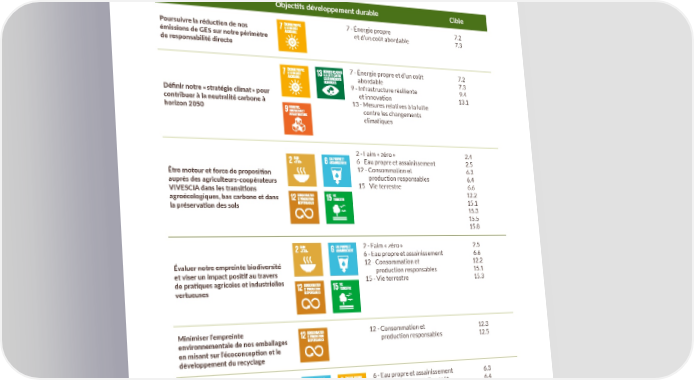 POUR ALLER PLUS LOIN TABLEAU DE CORRESPONDANCE AVEC LES OBJECTIFS Nos liens avec la terre Engagements Objec琀椀fs développement durable Cible 7 - Énergie propre 7.2 Poursuivre la réduc琀椀on de nos et d’un coût abordable 7.3 émissions de GES sur notre périmètre de responsabilité directe 7 - Énergie propre et d’un coût 7.2 abordable 7.3 9 - Infrastructure résiliente 9.4 Dé昀椀nir notre « stratégie climat » pour et innovation 13.1 contribuer à la neutralité carbone à 13 - Mesures relatives à la lutte horizon 2050 contre les changements climatiques 2 - Faim « zéro » 2.4 6 - Eau propre et assainissement 2.5 12 - Consommation et 6.3 Être moteur et force de proposi琀椀on production responsables 6.4 auprès des agriculteurs-coopérateurs 15 - Vie terrestre 6.6 VIVESCIA dans les transi琀椀ons 12.2 agroécologiques, bas carbone et dans 15.1 la préserva琀椀on des sols 15.3 15.5 15.8 2 - Faim « zéro » 2.5 6 - Eau propre et assainissement 6.6 12 - Consommation et 12.2 Évaluer notre empreinte biodiversité production responsables 15.1 et viser un impact posi琀椀f au travers 15 - Vie terrestre 15.3 de pra琀椀ques agricoles et industrielles vertueuses Minimiser l’empreinte 12 - Consommation et 12.3 environnementale de nos emballages production responsables 12.5 en misant sur l’écoconcep琀椀on et le développement du recyclage 6 - Eau propre et assainissement 6.3 7 - Énergie propre et d’un coût 6.4 abordable 7.1 8 - Travail décent et croissance 7.2 économique 7.3 9 - Infrastructure résiliente et 8.4 Promouvoir et garan琀椀r le respect de la innovation 9.4 Charte environnementale Groupe, en 12 - Consommation et 12.3 cours d’élabora琀椀on, sur tous nos sites production responsables 78
