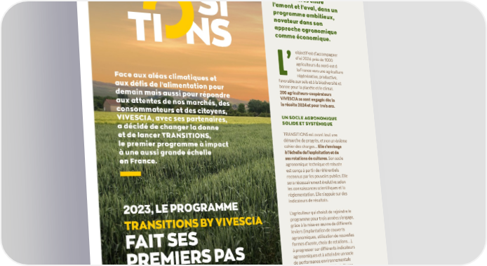 Une démarche de progrès collective qui unit les filières végétales et céréalières entre l’amont et l’aval, dans un programme ambitieux, novateur dans son approche agronomique comme économique. objectif est d’accompagner d’ici 2026 près de 1000 agriculteurs du nord-est d la France vers une agriculture L’ régénérative, productive, Face aux aléas climatiques et favorable aux sols et à la biodiversité et aux défis de l’alimentation pour bonne pour la planète et le climat. demain mais aussi pour répondre 200 agriculteurs-coopér200 agriculteurs-coopérateursateurs VIVESCIA se sont engagés dès laVIVESCIA se sont engagés dès la aux attentes de nos marchés, des la récolte 2024 et pour trois ans.la récolte 2024 et pour trois ans. consommateurs et des citoyens, UN SOCLE AGRONOMIQUE VIVESCIA, avec ses partenaires, SOLIDE ET SYSTÉMIQUE a décidé de changer la donne et de lancer TRANSITIONS, TRANSITIONS est avant tout une le premier programme à impact démarche de progrès, et non un énième cahier des charges… Elle s’Elle s’enenvisagevisage à une aussi grande échelle à l’à l’échelle de l’échelle de l’eexploitation et dexploitation et de en France. ses rotations de cultures. ses rotations de cultures. Son socle agronomique technique et robuste est conçu à partir de référentiels reconnus par les pouvoirs publics. Elle sera nécessairement évolutive selon les connaissances scienti昀椀ques et la réglementation. Elle s’appuie sur des 2023, LE PROGRAMME indicateurs de résultats. L’agriculteur qui choisit de rejoindre le TRANSITIONS BY VIVESCIA programme pour trois années s’engage, grâce à la mise en œuvre de différents leviers (implantation de couverts FAIT SES agronomiques, utilisation de nouvelles formes d’azote, choix de rotations… ), PREMIERS PAS à progresser sur différents indicateurs agronomiques et à atteindre un socle de performance environnementale dé昀椀ni : réduction des GES, résilience des sols, stockage carbone dans les sols et préservation de la biodiversité. Tout en restant libre de déterminer ses pratiques culturales en fonction de son contexte pédoclimatique et de son projet entrepreneurial. 30