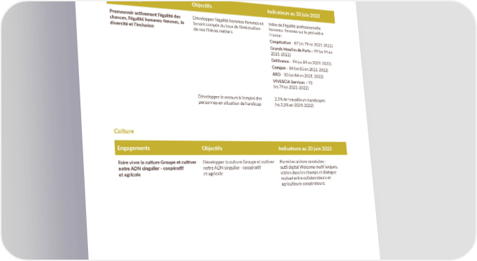 POUR ALLER PLUS LOIN Diversité et inclusion Engagements Objec琀椀fs Indicateurs au 30 juin 2023 Promouvoir ac琀椀vement l’égalité des Développer l’égalité hommes-femmes en Index de l’égalité professionnelle chances, l’égalité hommes-femmes, la tenant compte du taux de féminisation hommes- femmes sur le périmètre diversité et l’inclusion de nos 昀椀lières métiers France : Coopérative – 87 (vs 79 en 2021-2022) Grands Moulins de Paris – 99 (vs 94 en 2021-2022) Délifrance – 94 (vs 89 en 2021-2022) Compas – 84 (vs 83 en 2021-2022) ARD – 83 (vs 84 en 2021-2022) VIVESCIA Services – 93 (vs 79 en 2021-2022) Développer le recours à l’emploi des 2,1% de travailleurs handicapés personnes en situation de handicap (vs 2,5% en 2021-2022) Culture Engagements Objec琀椀fs Indicateurs au 30 juin 2023 Faire vivre la culture Groupe et cul琀椀ver Développer la culture Groupe et cultiver Parmi les actions conduites : notre ADN singulier - coopéra琀椀f notre ADN singulier - coopératif outil digital Welcome multi langues, et agricole et agricole visites dans les champs et dialogue mutuel entre collaborateurs et agriculteurs-coopérateurs. 77