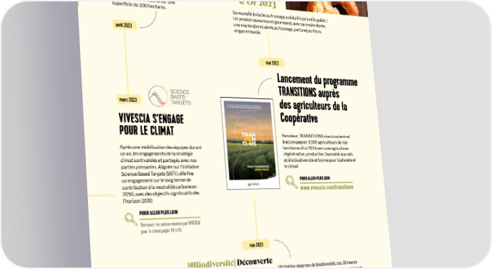 PANORAMA Premiers engrais décarbonés dans nos champs avril 2023 Dans la continuité de nos Délifrance, multiples initiatives de Snacking décarbonation, nous lançons des expérimentations de fertilisation d’Or 2023 à partir d’engrais décarbonés fabriqués par Fertiberia sur une Sa nouvelle brioche au fromage a séduit le jury et le public ! super昀椀cie de 200 hectares. Un produit savoureux et gourmand, avec sa croûte dorée, une mie tendre et aérée au fromage, parfumé au thym, avril 2023 origan et basilic. mai 2023 Lancement du programme TRANSITIONS auprès mars 2023 des agriculteurs de la VIVESCIA S’ENGAGE Coopérative POUR LE CLIMAT Novateur, TRANSITIONS vise à soutenir et à accompagner 1 000 agriculteurs de nos territoires d’ici 2026 vers une agriculture Après une mobilisation des équipes durant un an, les engagements de la stratégie régénérative, productive, favorable aux sols et à la biodiversité et bonne pour la planète et climat sont validés et partagés avec nos le climat. parties prenantes. Alignée sur l’Initiative Science Based Targets (SBTi), elle 昀椀xe un engagement sur le long terme de POUR ALLER PLUS LOIN contribution à la neutralité carbone en www.vivescia.com/transitions 2050, avec des objectifs signi昀椀catifs dès l’horizon 2030. POUR ALLER PLUS LOIN Retrouvez les actions menées par VIVESCIA pour le climat pages 40 à 43. mai 2023 [#Biodiversité] Découverte du projet de valorisation Véritables réserves de biodiversité, ces 30 mares sont restaurées dans le cadre d’un partenariat signé des mares dans les prairies pour cinq ans en septembre 2022 avec l’association du Chaourçois ! Symbiose. VIVESCIA soutient les paysages de biodiversité, avec la participation 昀椀nancière de Malteurop, Délifrance et Grands Moulins de Paris. POUR EN SAVOIR PLUS Un levier pour recréer et conserver des trames SUR LE PARTENARIAT AVEC vertes, dans la Marne, et bleues, dans l’Aube et L'ASSOCIATION SYMBIOSE, POUR les Ardennes, que les acteurs du projet ont pu DES PAYSAGES DE BIODIVERSITÉ découvrir sur le terrain. FLASHEZ LE QR CODE 55