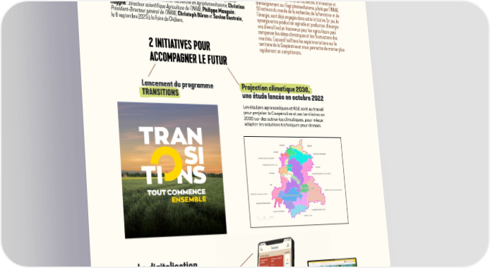 Partenariat entre l’INRAE et VIVESCIA pour l’agriphotovoltaïsme VIVESCIA est la première coopérative à rejoindre le consortium du Pôle national de recherche, d’innovation et Abraham Escobar Gutiérrez : Président du centre Inra Nouvelle-Aquitaine- d’enseignement sur I’agriphotovoltaïsme, piloté par l’INRAE. Poitiers et Directeur du Pôle National Recherche en Agriphotovoltaïsme, Christian 50 acteurs du monde de la recherche, de la formation et de Huyghe : Directeur scientifique Agriculture de l’INRAE, Philippe Mauguin : l’énergie, sont déjà engagés dans cette initiative. En jeu, la Président-Directeur général de l’INRAE, Christoph Büren et Savine Oustrain, synergie entre production agricole et production d’énergie : le 8 septembre 2023 à la Foire de Châlons. une diversification bienvenue pour les agriculteurs pour compenser les aléas climatiques et les fluctuations des marchés. L’accord facilitera les expérimentations sur le territoire de la Coopérative et nous permettra de monter plus 2 INITIATIVES POUR rapidement en compétences. ACCOMPAGNER LE FUTUR Lancement du programme Projection climatique 2030, TRANSITIONS une étude lancée en octobre 2022 Les équipes agronomiques et RSE sont au travail pour projeter la Coopérative et ses territoires en 2030 sur des scénarios climatiques, pour mieux adapter les solutions techniques pour demain. ENSEMBLE La digitalisation au service des agriculteurs Arterre, l’extranet des agriculteurs-coopérateurs VIVESCIA, est désormais disponible en application mobile : première application mobile globale pour les Coopératives en France ! L'application a été pensée pour répondre à leurs besoins en mobilité et en toute simplicité. Au menu : les dernières actus, une météo géolocalisée, la Bourse Lancement du site e-commerce, il donne aux céréales, le suivi des livraisons… et bien plus encore. accès à toute l’offre de produits et Déjà 2 700 utilisateurs convaincus. services de la Coopérative. 14