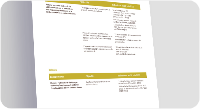 POUR ALLER PLUS LOIN Nos liens avec les hommes et les femmes Sécurité et bien-être au travail Engagements Objec琀椀fs Indicateurs au 30 juin 2023 Assurer un cadre de travail sûr Développer une culture sécurité juste et Taux de fréquence* (Tf) et bienveillant par la préven琀椀on prévenir les risques majeurs = 11,98 (vs 10,19 en 2021-2022)/ des risques psychosociaux et le taux de gravité* (Tg) = 0,83 renforcement de la culture sécurité (vs 0,64 en 2021-2022) 59 % sites sans accident avec arrêt sur 1 an (vs 66 % en 2021-2022) Culture juste et risques majeurs : 90 % des managers cibles formés, soit 563 managers Prévenir les risques psychosociaux 79 % de l’ensemble des managers/relais (RPS) en sensibilisant les managers et en formés aux RPS agissant sur les principaux facteurs de stress 49% des métiers ont mis en oeuvre des plans d’action Proposer un environnement de travail 13 accords qualité de vie au travail et 35 favorisant équilibre vie professionnelle/ accords télétravail vie personnelle 61 % télétravail 23 % qualité de vie au travail Talents Engagements Objec琀椀fs Indicateurs au 30 juin 2023 Booster l’a琀琀rac琀椀vité du Groupe Renforcer l’employabilité de nos 1,4 % de la masse salariale dédiés à la en tant qu’employeur et renforcer collaborateurs formation (vs 2 % en 2021-2022) l’employabilité de nos collaborateurs 96% de l’effectif présent au 30 juin 2023 a reçu au moins une formation (78,7 % en 2021-2022) *L’augmentation du nombre d’accidents est principalement d’origine ergonomique. Des arrêts prolongés sont une des causes de la dégradation du taux de gravité. Des plans d’action spéci昀椀ques sont en cours de déploiement. 76