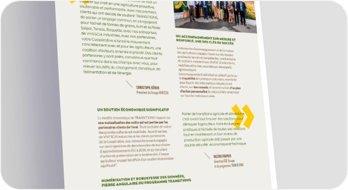 TOUS ACTEURS DU LIEN 8 septembre 2023, conférence de lancement à la Foire de Châlons-en-Champagne TRANSITIONS insuffle entre les acteurs des filières végétale et céréalière une nouvelle énergie, celle du faire-ensemble. TRANSITIONS porte une vision optimiste et positive de tout un collectif qui croit en une agriculture proactive, soutenable et performante. Avec nos premiers clients qui ont décidé de soutenir TRANSITIONS, de parler un langage commun, en s’engageant pour l’achat de tonnes de grains, Avril et sa filiale Saipol, Tereos, Roquette, avec nos entreprises UN ACCOMPAGNEMENT SUR MESURE ET de VIVESCIA Industries, avec nos partenaires, RENFORCÉ, UNE DES CLÉS DU SUCCÈS votre Coopérative a lancé le mouvement concrètement avec et pour les agriculteurs, une La démarche d’accompagnement et de formation coalition d’acteurs amenée à grandir. Des clients des agriculteurs engagés repose sur des équipes partenaires y sont prêts, convaincus que tout proches du terrain et compétentes : une trentaine de technico-commerciaux VIVESCIA volontaires, commence dans les champs avec vous, pour mobilisés et formés, secondés par des experts relever les défis du changement climatique, de agronomiques. l’alimentation et de l’énergie. L’accompagnement individuel et collectif porte sur la trtraçabilitéaçabilité des pratiques culturales, essentielle pour fournir des informations robustes à nos CHRISTOPH BÜREN clients, sur des conseilsdes conseils, et la construction d’un pland’un plan Président du Groupe VIVESCIA d’d’action personnaliséaction personnalisé de nature à faire progresser sur tous les indicateurs visés. UN SOUTIEN ÉCONOMIQUE SIGNIFICATIF Parler de transitions agricole et alimentaire, Le modèle économique de TRANSITIONS s’appuie sur c’est avant tout trouver des solutions pour une mutualisation des coûts qui est portée par lesune mutualisation des coûts qui est portée par les dérisquer l’agriculteur. Faire évoluer ses partenaires clients de l’partenaires clients de l’aavalval. Toute la chaîne de valeur pratiques à l’échelle de toutes ses rotations des grandes cultures est mobilisée : les entreprises tout en maintenant un bon niveau de de VIVESCIA Industries et les clients partenaires de la Coopérative, eux-mêmes fortement engagés production agricole doit passer par une sur des trajectoires de décarbonation de leur chaîne double sécurité : économique et technique. d’approvisionnement d’ici à 2030, et sur des plans d’action de préservation de la biodiversité. Chaque agriculteur engagé béné昀椀cie d’un soutien économique VALÉRIE FRAPIER signi昀椀catif*. directrice RSE Groupe et du programme TRANSITIONS NUMÉRISATION ET ROBUSTESSE DES DONNÉES, PIERRE ANGULAIRE DU PROGRAMME TRANSITIONS Amélioration des pratiques Valorisation des récoltes *Un soutien aux résultats et à la progression, en moyenne de 100 €/ha pour le niveau 1 (entrée) et 150 €/ha pour le niveau 2 (performance) par an selon les cultures concernées : une prime en euros par tonne de grains qui va au-delà du coût additionnel des leviers agronomiques. 31