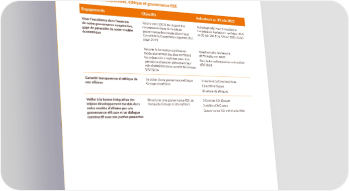 POUR ALLER PLUS LOIN TABLEAU SYNOPTIQUE DE NOS ENGAGEMENTS, DE NOS OBJECTIFS ET DE NOS PRINCIPAUX INDICATEURS. Nos liens au cœur de notre modèle coopératif et économique Gouvernance coopéra琀椀ve, éthique et gouvernance RSE Engagements Objec琀椀fs Indicateurs au 30 juin 2023 Viser l’excellence dans l’exercice Tendre vers 100 % du respect des Autodiagnostic Haut Conseil de la de notre gouvernance coopéra琀椀ve, recommandations du Guide de Coopération Agricole en synthèse : 84 % gage de pérennité de notre modèle gouvernance des coopératives Haut au 30 juin 2023 (vs 70% en 2021-2022) économique Conseil de la Coopération Agricole d’ici à juin 2023 Assurer la formation continue en Questionnaire des besoins mode pluriannuel des élus en ciblant de formation en cours les enjeux clés à maîtriser pour leur permettre d’assurer pleinement leur Plan de formation pluriannuel à dé昀椀nir d’ici 2024 rôle d’administrateur au sein du Groupe VIVESCIA Garan琀椀r transparence et éthique de Se doter d’une gouvernance éthique 4 réunions du Comité ethique nos a昀昀aires Groupe et métiers 11 alertes éthiques 30 référents éthiques Veiller à la bonne intégra琀椀on des Structurer une gouvernance RSE au 3 Comités RSE Groupe enjeux développement durable dans niveau du Groupe et des métiers 2 ateliers CA/Comex notre modèle d’a昀昀aires par une INDICATEURS Gouvernance RSE métiers clari昀椀ée gouvernance e昀케cace et un dialogue RSE construc琀椀f avec nos par琀椀es prenantes 71