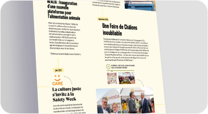 PANORAMA août 2023 MOISSON 2023 HÉTÉROGÈNE ET MITIGÉE Réalisée dans de bonnes conditions jusqu’à la troisième semaine de juillet, la moisson s’est alors compliquée du fait d’épisodes juillet 2023 pluvieux. La récolte se caractérise par une forte disparité dans les rendements comme dans la qualité selon les régions, NEALIA : Inauguration le type de sol et leur réserve hydrique. d’une nouvelle plateforme pour l’alimentation animale septembre 2023 Avec son entreprise Aliane*, NEALIA Une Foire de Châlons investit 5 millions d’euros dans les Ardennes pour renforcer la production d’aliments humides à destination inoubliable de l’alimentation animale et de la méthanisation. NEALIA con昀椀rme Partenaire 昀椀dèle de la Foire de Châlons-en-Champagne (51), son leadership sur ce segment, VIVESCIA est au rendez-vous de cette édition 2023. Les visiteurs levier d’accélération de la transition sont embarqués dans un nouveau voyage « des champs à la table », agroécologique et de performance encore plus immersif. Grande nouveauté 2023, le Fournil fait son économique pour le territoire. entrée dans le Village VIVESCIA, où l’on peut apprendre à faire du pain et le déguster en compagnie de la Confrérie des Boulangers *Détenue à parts égales avec Sanders. Grands Moulins de Paris… et, bien sûr, encore plus d’ateliers pour les petits et les grands, et de séances de dégustation pour les gourmands avec Francine et Délifrance ! RETROUVEZ LE BEST OF DE LA FOIRE DE CHÂLONS 2023, EN FLASHANT CE QR CODE juin 2023 La culture juste s’invite à la Safety Week Lors de notre septième Semaine de la sécurité au travail, nos équipes du monde entier ont échangé autour de la culture juste, l’un des piliers de notre programme CARE 2025, thématique majeure de cette édition. Visites ministérielles et dialogue avec les parties prenantes institutionnelles. 59