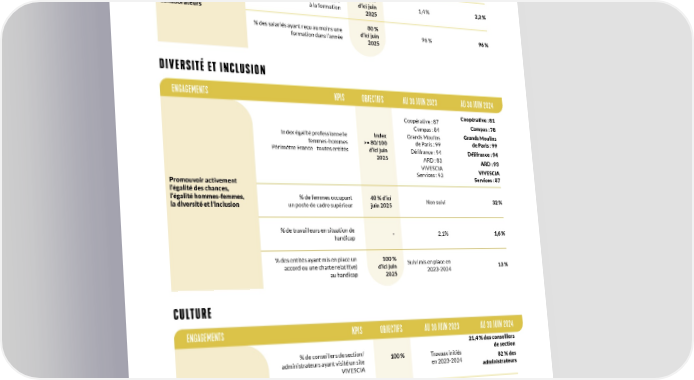 TALENTS ENGAGEMENTS KPIS OBJECTIFS AU 30 JUIN 2023 AU 30 JUIN 2024 Campagne en cours % de salariés ayant un entretien 100 % 50 % annuel et un plan de développement d’ici juin (hors Délifrance) Suite évolution du personnalisé 2025 processus Booster l’attractivité du Groupe en tant 3 % % de la masse salariale dédié qu’employeur et renforcer d’ici juin 1,4 % 2,2 % à la formation l’employabilité de nos 2025 collaborateurs 80 % % des salariés ayant reçu au moins une d’ici juin 96 % 96 % formation dans l’année 2025 DIVERSITÉ ET INCLUSION ENGAGEMENTS KPIS OBJECTIFS AU 30 JUIN 2023 AU 30 JUIN 2024 Coopérative : 87 Coopérative : 81 Compas : 78 Compas : 84 Index égalité professionnelle Index Grands Moulins Grands Moulins de Paris : 99 femmes-hommes >= 80/100 de Paris : 99 Périmètre France - toutes entités d’ici juin Délifrance : 94 Délifrance : 94 2025 ARD : 83 ARD : 93 VIVESCIA VIVESCIA Services : 93 Promouvoir activement Services : 87 l’égalité des chances, l’égalité hommes-femmes, % de femmes occupant 40 % d’ici Non suivi 32 % la diversité et l’inclusion un poste de cadre supérieur juin 2025 % de travailleurs en situation de - 2,1% 1,6 % handicap % des entités ayant mis en place un 100 % Suivi mis en place en accord ou une charte relatif(ve) d’ici juin 13 % au handicap 2025 2023-2024 CULTURE ENGAGEMENTS KPIS OBJECTIFS AU 30 JUIN 2023 AU 30 JUIN 2024 21,4 % des conseillers de section % de conseillers de section/ 100 % Travaux initiés administrateurs ayant visité un site 82 % des VIVESCIA en 2023-2024 administrateurs Développer la culture Groupe et cultiver % de collaborateurs ayant suivi 100 % Non communiqué 42 % notre ADN singulier Welcome VIVESCIA à 2025 coopératif et agricole % de cadres supérieurs ayant eu Parcours d’intégration un parcours d’intégration incluant 100 % - Route du grain relancé à la connaissance des enjeux de la à 2025 Coopérative et des enjeux agricoles partir d’octobre 2024 64