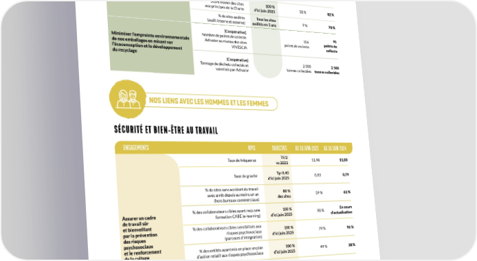 Pour aller plus loin MANAGEMENT ENVIRONNEMENTAL ENGAGEMENTS KPIS OBJECTIFS AU 30 JUIN 2023 AU 30 JUIN 2024 80 % à juin 2024 78 % des sites % de sites respectant la Charte Baseline ont un score environnementale du Groupe 100 % Promouvoir et garantir le respect supérieur à 80 à juin 2025 de la Charte environnementale du Groupe sur tous nos sites Score moyen des sites 100 % aux principes de la Charte d’ici juin 2025 58 % 82 % % de sites audités Tous les sites (audit interne et externe) audités en 5 ans 9 % 70 % [Coopérative] 95 Nombre de points de collecte 106 points de Minimiser l’empreinte environnementale Adivalor au niveau des sites points de collecte collecte de nos emballages en misant sur VIVESCIA l’écoconception et le développement du recyclage [Coopérative] 2 300 2 500 Tonnage de déchets collectés et tonnes collectées tonnes collectées valorisés par Adivalor NOS LIENS AVEC LES HOMMES ET LES FEMMES SÉCURITÉ ET BIEN-ÊTRE AU TRAVAIL ENGAGEMENTS KPIS OBJECTIFS AU 30 JUIN 2023 AU 30 JUIN 2024 Taux de fréquence TF/2 vs 2021 11,98 11,03 Taux de gravité Tg