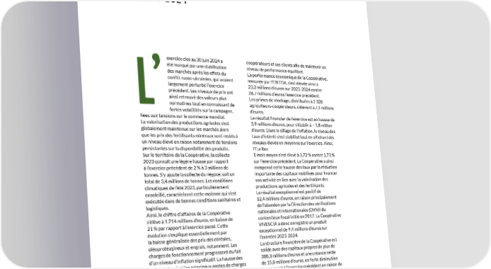 COMPTES SOCIAUX de la coopérative AU 30 JUIN 2024 coopérateurs et ses clients afin de maintenir un exercice clos au 30 juin 2024 a été marqué par une stabilisation niveau de performance équilibré. des marchés après les effets du La performance économique de la Coopérative, mesurée par l’EBITDA, s’est élevée ainsi à conflit russo-ukrainien, qui avaient largement perturbé l’exercice 23,2 millions d’euros sur 2023-2024 contre précédent. Les niveaux de prix ont 26,7 millions d’euros l’exercice précédent. ainsi retrouvé des valeurs plus Les primes de stockage, distribuées à 3 328 L’ normatives tout en connaissant de agriculteurs-coopérateurs, s’élèvent à 7,1 millions fortes volatilités sur la campagne, d’euros. liées aux tensions sur le commerce mondial. Le résultat financier de l’exercice est en hausse de La valorisation des productions agricoles s’est 3,9 millions d’euros, pour s’établir à – 1,8 million globalement maintenue sur les marchés alors d’euros. Dans le sillage de l’inflation, le niveau des taux d’intérêt s’est stabilisé tout en affichant des que les prix des fertilisants minéraux sont restés à un niveau élevé en raison notamment de tensions niveaux élevés en moyenne sur l’exercice. Ainsi, persistantes sur la disponibilité des produits. l’Euribor Sur le territoire de la Coopérative, la collecte 1 mois moyen s’est élevé à 3,72 % contre 1,73 % sur l’exercice précédent. La Coopérative a ainsi 2023 connaît une légère hausse par rapport compensé cette hausse des taux par la réduction à l’exercice précédent de 2 % à 3 millions de tonnes. S’y ajoute la collecte du négoce, soit un importante des capitaux mobilisés pour financer son activité en lien avec la valorisation des total de 3,4 millions de tonnes. Les conditions productions agricoles et des fertilisants. climatiques de l’été 2023, particulièrement ensoleillé, caractérisent cette moisson qui s’est Le résultat exceptionnel est positif de exécutée dans de bonnes conditions sanitaires et 12,4 millions d’euros, en raison principalement logistiques. de l’abandon par la Direction des vérifications Ainsi, le chiffre d’affaires de la Coopérative nationales et internationales (DVNI) du contentieux fiscal initié en 2017. La Coopérative s’élève à 1 214 millions d’euros, en baisse de VIVESCIA a donc enregistré un produit 21 % par rapport à l’exercice passé. Cette évolution s’explique essentiellement par exceptionnel de 9,4 millions d’euros sur la baisse généralisée des prix des céréales, l’exercice 2023-2024. oléoprotéagineux et engrais, notamment. Les La structure financière de la Coopérative est charges de fonctionnement progressent du fait solide avec des capitaux propres de plus de 388,3 millions d’euros et une créance nette d’un niveau d’inflation significatif. La hausse des prix touche ainsi les principaux postes de charges de 15,8 millions d’euros, en forte diminution opérationnelles comme l’énergie, le transport par rapport à l’exercice précédent en raison de l’allégement du poids des stocks de grains et ou la main-d’œuvre. Dans ce contexte perturbé, la Coopérative a accompagné les associés- d’engrais au 30 juin 2024. 54