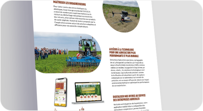 Ouvrir de nouveaux chemins CONCILIER RENTABILITÉ ET DÉCARBONATION La décarbonation de l’agriculture est un défi clé. La fertilisation azotée est l’un des enjeux majeurs. Des réflexions et des partenariats sont engagés, notamment au travers du programme TRANSITIONS. MAÎTRISER LES BIOAGRESSEURS Pour lutter contre des stress biotiques ou abiotiques, le service agronomie de VIVESCIA a mené de nombreuses expérimentations sur le recours au désherbage mécanique ou encore les bio-intrants, alternatives intéressantes aux produits de santé végétale. Autant de leviers proposés par la Coopérative comme autant de solutions adaptées et efficaces pour nos associés-coopérateurs. ACCÉDER À LA TECHNOLOGIE POUR UNE AGRICULTURE PLUS PERFORMANTE ET PLUS DURABLE Détection d’adventices par drone, cartographie de sol, pilotage de la protection par fongicide au moyen d’outils d’aide à la décision (OAD), stations météo connectées, largage de trichogrammes par drone, robots... les solutions technologiques sont nombreuses. L’agriculture de précision, comme la fertilisation ultralocalisée à partir de capteurs embarqués sur un automoteur ou le semoir de précision, est un moyen efficace de réduire son impact environnemental tout en optimisant les performances de son exploitation. DIGITALISER NOS OFFRES AU SERVICE DES ENTREPRISES AGRICOLES Véritable outil de gestion de l’exploitation, notre + de + de application mobile Arterre, à disposition des agriculteurs-coopérateurs, permet d’accéder, 7j/7 – 24h/24, à la Bourse aux grains, de consulter des informations générales et des informations agronomiques et d’accéder à la formule e-commerce 4 680 2 200 ArterreSHOP, pour bénéficier en toute autonomie de associés-coopérateurs associés-coopérateurs l’ensemble de nos offres produits et services. ont téléchargé notre accèdent à l’offre application Arterre VIVESCIA via ArterreSHOP RAPPORT INTÉGRÉ 2023-2024 21