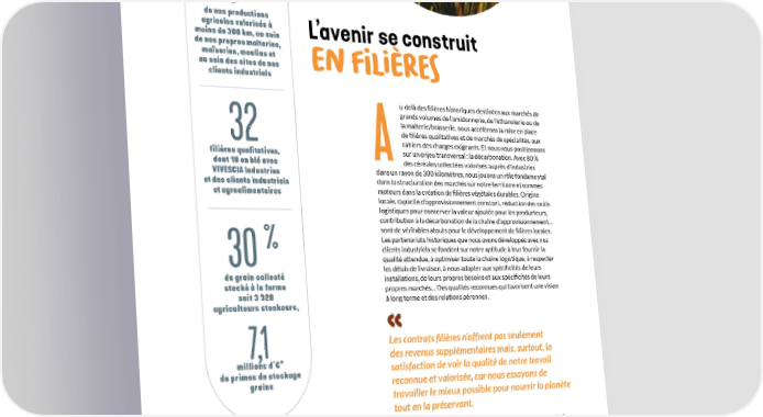 Ouvrir de nouveaux chemins Le SavieZ -VOus ? % 80 de nos productions agricoles valorisés à L’avenir se construit moins de 300 km, au sein de nos propres malteries, maïseries, moulins et au sein des sites de nos en filières clients industriels u-delà des filières historiques destinées aux marchés de grands volumes de l’amidonnerie, de l’éthanolerie ou de la malterie/brasserie, nous accélérons la mise en place 32 de filières qualitatives et de marchés de spécialités, aux cahiers des charges exigeants. Et nous nous positionnons filières qualitatives, sur un enjeu transversal : la décarbonation. Avec 80 % dont 18 en blé avec Ades céréales collectées valorisés auprès d’industries VIVESCIA Industries dans un rayon de 300 kilomètres, nous jouons un rôle fondamental et des clients industriels dans la structuration des marchés sur notre territoire et sommes et agroalimentaires moteurs dans la création de filières végétales durables. Origine locale, capacité d’approvisionnement constant, réduction des coûts logistiques pour conserver la valeur ajoutée pour les producteurs, contribution à la décarbonation de la chaîne d’approvisionnement… sont de véritables atouts pour le développement de filières locales. % Les partenariats historiques que nous avons développés avec nos clients industriels se fondent sur notre aptitude à leur fournir la 30 qualité attendue, à optimiser toute la chaîne logistique, à respecter du grain collecté les délais de livraison, à nous adapter aux spécificités de leurs stocké à la ferme installations, de leurs propres besoins et aux spécificités de leurs soit 3 328 propres marchés… Des qualités reconnues qui favorisent une vision agriculteurs stockeurs, à long terme et des relations pérennes. 7,1 Les contrats filières n’offrent pas seulement millions d’€* des revenus supplémentaires mais, surtout, la de primes de stockage satisfaction de voir la qualité de notre travail grains reconnue et valorisée, car nous essayons de travailler le mieux possible pour nourrir la planète tout en la préservant. CYRIL COLLOT, Associé-coopérateur à Maisons-en-Champagne (51) *8,23 €/T en moyenne (hors Majorations bi-mensuelles). Les primes de 17 € pour le stockage long et de 8 € pour le court sont corrélées au strict respect du planning logistique d’enlèvement des grains piloté par la Coopérative. Dans le laboratoire d’essais de panification du moulin de Brienne-Le-Château. RAPPORT INTÉGRÉ 2023-2024 23