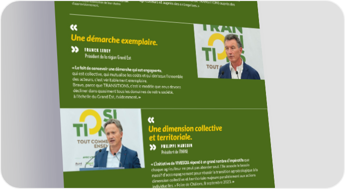 ILS TÉMOIGNENT... Hypothèses de travail validées ! BASTIEN SACHET 1 Directeur de la Fondation Earthworm , partenaire fondateur de la coalition « TRANSITIONS place vraiment la France à l’avant-garde ! Après presque 2 ans de travail collectif, mais forcément un peu théorique, nous avons pu, cette année, valider l’attractivité de TRANSITIONS auprès des 1. Earthworm est une organisation internationale à agriculteurs et auprès des entreprises. » but non lucratif qui accompagne les entreprises dans la responsabilisation de leur chaîne d’approvisionnement. Une démarche exemplaire. FRANCK LEROY Président de la région Grand Est « Le fait de concevoir une démarche qui est engageante, qui est collective, qui mutualise les coûts et qui dérisque l’ensemble des acteurs, c’est véritablement exemplaire. Bravo, parce que TRANSITIONS, c’est le modèle que nous devons décliner dans quasiment tous les domaines de notre société, à l’échelle du Grand Est, évidemment . » Une dimension collective et territoriale. PHILIPPE MAUGUIN Président de l’INRAE « L’initiative de VIVESCIA répond à un grand nombre d’impératifs que chaque agriculteur ne peut pas aborder seul. Elle associe le besoin massif d’accompagnement pour réussir la transition agroécologique à la dimension collective et territoriale majeure parallèlement aux actions individuelles. » Foire de Châlons, 8 septembre 2023. » Un transfert de valeurs vertueux. BRUNO BONNEL Secretaire Général pour l’Investissement, chargé du Plan France 2030. « Les coopératives agricoles sont des relais très importants. Nous soutenons le programme TRANSITIONS avec enthousiasme et engagement. L’idée, c’est vraiment de faire jouer l’amont et l’aval Christoph Büren, Président du Groupe VIVESCIA, pour un transfert de valeurs vertueux. L’Etat continuera à soutenir et Bruno Bonnell au Salon de l’agriculture, cette coalition au fil de son développement. » le lundi 26 février 2024.