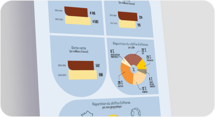 Pour aller plus loin Chiffre d'affaires EBITDA (en millions d’euros) (en millions d’euros) 2023-2024 4 145 2023-2024 224 2022-2023 4 583 2022-2023 195 Répartition du chiffre d’affaires Dette nette par pôle 22 % (en millions d’euros) 6 % BVP AUTRES MÉTIERS INDUSTRIELS 25 % COOPÉRATIVE 2023-2024 542 % 2022-2023 596 6 % 29 % AUTRES MALTERIE MÉTIERS 12 % AGRICOLES MEUNERIE Répartition du chiffre d’affaires par zone géographique 44 % % 56 % France International RAPPORT INTÉGRÉ 2023-2024 57