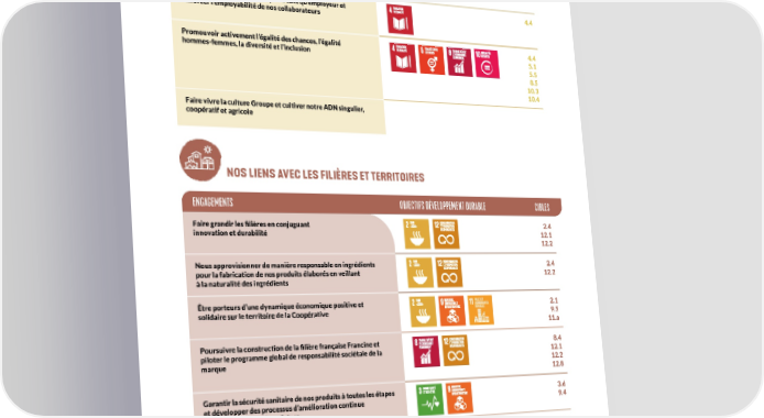 PPoouur ar alllleer pr plluus ls looiinn NOS LIENS AVEC LES HOMMES ET LES FEMMES ENGAGEMENTS OBJECTIFS DÉVELOPPEMENT DURABLE CIBLES Assurer un cadre de travail sûr et bienveillant 3.6 par la prévention des risques psychosociaux 8.8 et le renforcement de la culture sécurité Booster l’attractivité du Groupe en tant qu’employeur et 4.4 renforcer l’employabilité de nos collaborateurs Promouvoir activement l’égalité des chances, l’égalité 4.4 hommes-femmes, la diversité et l’inclusion 5.1 5.5 8.5 10.3 10.4 Faire vivre la culture Groupe et cultiver notre ADN singulier, coopératif et agricole NOS LIENS AVEC LES FILIÈRES ET TERRITOIRES ENGAGEMENTS OBJECTIFS DÉVELOPPEMENT DURABLE CIBLES Faire grandir les filières en conjuguant 2.4 innovation et durabilité 12.1 12.2 Nous approvisionner de manière responsable en ingrédients 2.4 pour la fabrication de nos produits élaborés en veillant 12.2 à la naturalité des ingrédients Être porteurs d’une dynamique économique positive et 2.1 solidaire sur le territoire de la Coopérative 9.5 11.a Poursuivre la construction de la filière française Francine et 8.4 piloter le programme global de responsabilité sociétale de la 12.1 marque 12.2 12.8 Garantir la sécurité sanitaire de nos produits à toutes les étapes 3.d et développer des processus d’amélioration continue 9.4 en anticipant les enjeux futurs Renforcer l’impact positif de nos implantations industrielles 4.3 France et monde auprès des communautés locales 4.4 4.5 11.a 12.3 Partager nos savoirs et savoir-faire, contribuer au 4.3 développement de l’entrepreneuriat et à la pérennité 4.4 des métiers agricoles 4.5 4.7 17.16 RAPPORT INTÉGRÉ 2023-2024 69