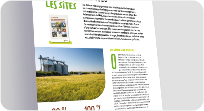 Management envirOnnemental : progresser sur tous Au-delà de nos engagements pour le climat, la biodiversité et les sites les transitions agroécologiques sur nos territoires coopératifs, notre crédibilité commence par les pratiques sur nos sites. Dès le lancement de LINK, nous avons donc construit un socle de principes environnementaux ambitieux et solides à mettre en place CHARTE LA ALE ONNEMENT ENVIR CIA de manière harmonisée sur l’ensemble de nos sites : notre Charte OUPE VIVES DU GR AIRES ALITÉS COMPLÉMENT 3 MOD ALE NT E M E N N RO NVI HARTE E UDIT POUR PROGRESSERLA C IA de management environnemental constitue l’élément fondateur DE SUIVI ET D’A PE VIVESC U RO U G par le Groupe D le référentiel établi appuie sur - Elle s’ aluation v ’auto-é LElle de la Charte. he de c ar m rs de , sa dé e v a assurer du respect des principes r de s’ IA, au t et permet pe VIVESC ou VIVESCIA Le Gr pes i nc i pr e de l n soc u e r i ru onst c à é engag est ’ s e, abl r Du t est réalisée chaque année par un référent désigné au sein du site. oppemen l e v Dé e d e r t mè i ils r pé son r u du Groupe, s es d i l métiers so t e x eu xperts i t i b m a taux n isés par des eme - Réal ne on r i v n Les audits internesIls contribuent à nourrir le e d’une culture transversale. Elle renforce notre gestion des risques les sites. irecte. application des principes sur responsabilité d valuent l’ évironnemental. Un échantillonnage en ns de management ommu pes c i nc i sur les enjeux t des pr i bl ta dialogue e é l ta n me onne r i v n e E art h a C i, l ns Ai t r e i n a établi chaque année. e v é t à pr n se i v s l des sites audités ser pe. I ou Gr u d rs e i t es mé s l ou t es à bl ca i appl audit indépendant, ils act de nos mp i ’ r l nue i m i t d Réalisés par un cabinet d’ , e x - tau n me xternes ne e on r i v n audits ues e Les sq i es r r l e et s i r t i a m Charte la de principes des er e r ég t n r i effectiv de pou i s gu application ou l’ e n art h érifier v a C , l de e tag o l i l de p i t permettent e ou tabl du i ér és. V t i v i ct a-financière a xtr e performance la de stants xi e . audits és environnementaux et instaure un certain nombre de principes en lien t les i v i ct dans on de nos a i t s’intègrent es a g ans l t d n me onne r i v n e ’ Groupe.l e L . 4 2 0 2 n fi a l à i c i ’ d s e t i s s e d % 0 0 1 r pa e é t c immédiate e p s e r place e r t ê t i o mise en d e l l objet de la E l’ a faire vr IA s de VIVESC l e i r non-conformité de st u nd oute es i T t i es s c s l e u v o a e t ouvr on c i t ca i appl ’ e d r t mè i r actions de remise en conformité pé n d’ es, ou d’un pla ses t e e v i t a r actions correctiv oopé d’ C a de l année Groupe ’ l e ou t et/ ou rts t e eau métier es ouv t i al (niv es s l es, i centr r st en u nd I t e ms i e échéances précises et validées R des de x u e c t n o d , ux a e r u b ns i a t r e c e u q i ns i a s e l o c i gr a s e l a i l VIVESCIA).fi avec des thématiques clés : énergie, émissions de gaz à effet de serre, ne. i Se - r u s - ry v ’I d TÉ ET DE PÉRENNITÉ UNE SOURCE DE FIERplan chacun, sur le vironnementale engage chacune et Notre Charte En impose de repenser e respect de ses principes individuel et collectif. Lpar- , certains gestes et habitudes au quotidien, de eau, biodiversité, co-produits et déchets, nuisances et pollution. agir certaines manières d’ atiques, de mesurer sans cesse nos progrès… xpériences et bonnes pr tager eactivités est une vironnement dans la conduite de nos en l’ ation de ’intégr Lde notre capacité à faire face aux priorité absolue. Il en va de notre crédibilité, changements, et donc de la pérennité de nos activités. . Une publication de la direction de la communication du Groupe VIVESCIA. Février 2023. Ne pas jeter sur la voie publique. Crédit photos : Guillaume Czerw, Axel Coeuret, VIVESCIA. Imprimerie IRL, 6 rue Lucien Trousset, 51350 Cormontreuil 01/02/2023 09:22:1401/02/2023 09:22:14 20230110_CharteEnvironnementale_Depliant_A5-V5DEF.indd 1-320230110_CharteEnvironnementale_Depliant_A5-V5DEF.indd 1-3 UN SÉMINAIRE ANNUEL rganisé pour la deuxième année à Reims (51) le 14 octobre 2023, ce séminaire est par excellence un lieu de rencontre et d’échange d’expérience sur le déploiement de notre Charte. Très Oattendu, il a réuni quelque 120 personnes (en présentiel et en distanciel) : patrons de site, responsables QHSE, directeurs industriels et techniques, responsables de pôle et d’exploitation des territoires de la Coopérative. Au programme : prise de parole d’une vingtaine d’intervenants des différents métiers du Groupe et une dizaine de bonnes pratiques partagées par les métiers (système de management de l’environnement, énergie, eau...). Ce fut aussi l’occasion de revenir sur toutes les modalités d’audit, sur les taux de conformité par métier et de se projeter sur des axes de travail pour que tous les sites soient conformes à la Charte d’ici mi-2025. Ce séminaire a été reconduit le 15 octobre 2024. Des ateliers thématiques entre les différents métiers seront organisés tout au long de l’année pour poursuivre les échanges d’expérience et de 82 % 100 % bonnes pratiques. C’est le score moyen de L’objectif est que 100 % des DES AUDITS INTERNES conformité à la Charte de sites respectent la Charte management environnemental d’ici juin 2025 Au-delà du suivi au travers des autoévaluations, des VIVESCIA, obtenu par nos sites audits se mettent en place : cinq audits à blanc ont industriels en juin 2024, eu lieu de janvier à juin 2024 au sein de différentes en progression significative activités (malt, meunerie, BVP, maïs, biotechnologies (58 % en 2023) industrielles). Les premiers audits externes se sont déroulés cet été. 38