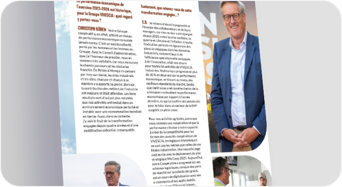 Rencontre avec La performance économique de Justement, que retenez-vous de cette l’exercice 2023-2024 est historique, transformation engagée… ? pour le Groupe VIVESCIA : quel regard C.B. y portez-vous ? Je retiens d’abord la pugnacité et l’énergie des collaborateurs et de leurs CHRISTOPH BÜREN Notre Groupe managers, car rien ne leur a été épargné coopératif a, en effet, atteint un niveau depuis 2020, entre la crise sanitaire, la de performance économique consolidé guerre en Ukraine et l’inflation. Ensuite, jamais connu. C’est un succès collectif, l’exécution patiente et rigoureuse des porté par les hommes et les femmes du plans stratégiques dans les domaines Groupe. Avec le Conseil d’administration, industriels, commerciaux et de que j’ai l’honneur de présider, nous en l’efficience opérationnelle conjugués sommes très satisfaits, car nous mesurons à de l’innovation, a fait son œuvre le chemin parcouru et les obstacles pour toutes les activités de VIVESCIA franchis. De Reims à Meoqui en passant Industries. Malteurop a progressé de plus par Ivry-sur-Seine, les sites industriels de 30 % en deux ans sur sa performance et les silos, chacune et chacun à sa économique, se hissant au niveau des meilleurs standards du marché, tandis manière y a apporté sa pierre. Bien sûr, que Délifrance a retrouvé le chemin de la la contribution des métiers de l’industrie croissance en doublant sa performance est majeure et était attendue. Les bons économique par rapport à l’année résultats sont d’autant plus notables dernière, ce qui lui confère des atouts clés que nos activités ont évolué dans un environnement économique perturbé et pour le futur dans un secteur de la BVP instable avec une consommation mondiale surgelée en plein essor. en berne. Aussi, dans ce contexte, Pour nos activités agricoles, parce que j’y vois le fruit de la transformation nous sommes une coopérative et que la engagée depuis quatre années et d’une performance s’évalue à notre capacité mobilisation collective remarquable. à créer de la compétitivité pour les fermes des associés-coopérateurs de VIVESCIA, les logiques économiques ne sont pas les mêmes que celles de nos filiales industrielles. Une nouvelle page s’est écrite avec le déploiement du plan stratégique Ma Coop 2025. Aujourd’hui, notre Coopérative a progressé sur ses schémas logistiques, conquis des parts de marché sur la collecte des grains, est en cours de digitalisation avec son e-commerce et ses applis mobile, a renforcé ses filières et innove… ... RAPPORT INTÉGRÉ 2023-2024 13