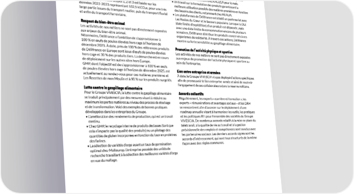 Pour aller plus loin THÉMATIQUES RÉGLEMENTAIRES Les thématiques réglementaires non abordées dans le rapport • Un cahier des charges intégrant des aspects qualité rigoureux afin d’avoir un grain qui répond aux contraintes des étapes de de développement Durable 2023-2024 sont adressées ici. transformation, notamment chez KALIZEA pour le maïs. Émissions de gaz à effet de serre du transport • Un travail sur la formulation des produits garantissant la meilleure utilisation possible des matières premières en fonction La partie transport des scopes 1, 2 et 3 est basée sur les données 2022-2023 représentant 532,5 ktCO e, pour une très des besoins des clients, notamment chez NEALIA. 2 • Les plateformes de Délifrance ont établi un partenariat avec large partie issues du transport routier, puis du transport fluvial Les Restos du Cœur et le Secours populaire. Lorsque la DLE et enfin du transport ferroviaire. (date limite d’expédition) d’un produit est dépassée, mais Respect du bien-être animal avec une date limite de consommation encore de plusieurs Les activités de nos métiers ne sont pas directement exposées semaines, Délifrance distribue les produits concernés à ces aux enjeux du bien-être animal. organismes de solidarité. À travers ces actions, Délifrance Néanmoins, Délifrance a l’ambition de s’approvisionner à montre sa forte sensibilité au gaspillage alimentaire. 100 % en œufs de poules élevées hors cage à l’horizon de décembre 2025. À date, près de 100 % des références produits Promotion de l’activité physique et sportive de Délifrance en Europe sont issus d’œufs de poules élevées Les activités de nos métiers ne sont pas directement exposées hors cage et 30 % des produits tiers. La démarche est en cours aux enjeux de promotion de l’activité physique et sportive au de déploiement sur les autres sites hors Europe. sein de l’entreprise. GMP, dont l’objectif est de s’approvisionner à 100 % en œufs de poules élevées hors cage à l’horizon de décembre 2025, est Lien entre entreprise et armées actuellement au rendez-vous pour ces matières premières et À date, le Groupe VIVESCIA n’a pas déployé d’actions spécifiques Les Recettes de mon Moulin et à 90 % sur les produits surgelés. afin de promouvoir le lien entreprise-armée et ainsi de soutenir l’engagement de ses collaborateurs dans la réserve militaire. Lutte contre le gaspillage alimentaire Pour le Groupe VIVESCIA, la lutte contre le gaspillage alimentaire Accords collectifs se traduit principalement par des mesures visant à réduire au Régulièrement, les experts « carrière et formation », les maximum les pertes matières au niveau des process de stockage experts « rémunérations et avantages sociaux » et les DRH et de transformation. Voici des exemples de bonnes pratiques se rencontrent afin d’avancer sur le déploiement d’une développées dans les entreprises du Groupe. roadmap annuelle visant à harmoniser les outils, les pratiques • L’amélioration des rendements de production, qui est un travail et les politiques RH pour l’ensemble des sociétés du Groupe continu. VIVESCIA. De nombreux accords relatifs à la mise en place du • Chez GMP, le recyclage interne de produits déclassés (tant que télétravail, à la qualité de vie au travail et à la gestion cela n’impacte pas la qualité des produits) ou un pilotage des prévisionnelle des emplois et compétences sont conclus avec quantités de gluten incorporées en fonction du taux en protéines les partenaires sociaux. Les derniers accords signés sont les des farines. accords d’intéressement, qui sont tous structurés de la même • La sélection de variétés d’orge ayant un taux de germination façon avec des règles communes. optimal chez Malteurop. L’entreprise possède des unités de recherche travaillant à la sélection des meilleures variétés d’orge en vue du maltage. RAPPORT INTÉGRÉ 2023-2024 73