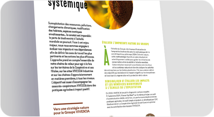 BIoDiverSIté : agir de FaçOn systémique Surexploitation des ressources, pollutions, changements climatiques, modification des habitats, espèces exotiques envahissantes... le constat est imparable : la perte de biodiversité à l’échelle ÉVALUER L’EMPREINTE NATURE DU GROUPE mondiale se poursuit. Face à cet enjeu majeur, nous nous sommes engagés à l’échelle du Groupe, des travaux d’évaluation de évaluer nos impacts et nos dépendances l’empreinte biodiversité selon la méthodologie SBTN afin de définir les axes de travail les plus ont été lancés au printemps 2024. Orientée nature, pertinents et les actions les plus efficaces. cette méthodologie fournit un cadre structuré et L’approche prend en compte l’ensemble de scientifiquement validé pour guider les initiatives de notre chaîne de valeur pour agir à la fois Àconservation et de durabilité à l’échelle mondiale. Cette initiative reconnaît la corrélation entre le climat sur les territoires de la Coopérative et ses et les systèmes naturels et cherche à aligner les activités filiales, sur les sites VIVESCIA Industries des entreprises sur les limites planétaires. Elle nous amène à définir et sur les chaînes d’approvisionnement des objectifs qui minimisent les impacts négatifs sur les écosystèmes en matières premières, à tous les niveaux. et favorisent la régénération et la protection de la nature. L’objectif est aussi d’accompagner les SENSIBILISER ET ÉVALUER LES IMPACTS associés-coopérateurs VIVESCIA dans des ET LES BÉNÉFICES BIODIVERSITÉ pratiques agricoles à impact positif. À L’ÉCHELLE DE L’EXPLOITATION En 2022, VIVESCIA lançait le diagnostic carbone simplifié. ® À l’automne 2024, il lance AgriBest sur le même principe : un outil d’autoévaluation dédié, cette fois, à la performance biodiversité des pratiques agricoles. Un outil simple et gratuit, co-développé par CDC Vers une stratégie nature Biodiversité et La Coopération Agricole Grand Ouest et optimisé avec la contribution des équipes VIVESCIA. pour le Groupe VIVESCIA 1 2 3 SENSIBILISER ÉVALUER DÉFINIR LA STRATÉGIE 2022 2024 2025 er Décembre • Évaluer l’empreinte biodiversité du Groupe pour identifier 1 semestre Fresque biodiversité les impacts les plus significatifs Définir des orientations stratégiques proposée lors du forum • Sensibiliser et évaluer les impacts et les bénéfices biodiversité à l’échelle de nature pour le Groupe VIVESCIA l’exploitation agricole pour les agriculteurs-coopérateurs VIVESCIA 36