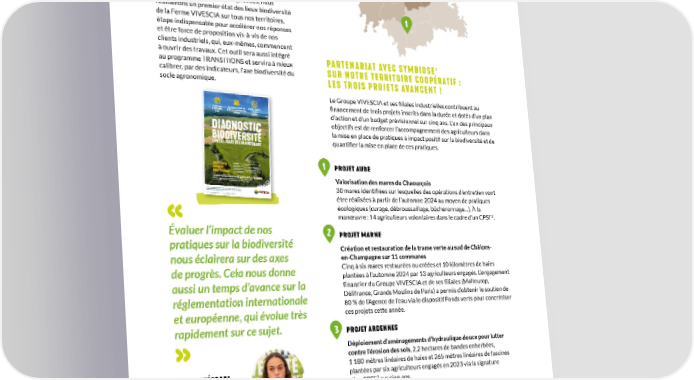 LINK en action 3 2 Avec l’analyse de tous les diagnostics, nous réaliserons un premier état des lieux biodiversité 1 de la Ferme VIVESCIA sur tous nos territoires, étape indispensable pour accélérer nos réponses et être force de proposition vis-à-vis de nos clients industriels, qui, eux-mêmes, commencent à ouvrir des travaux. Cet outil sera aussi intégré 1 au programme TRANSITIONS et servira à mieux PARTENARIAT AVEC SYMBIOSE calibrer, par des indicateurs, l’axe biodiversité du SUR NOTRE TERRITOIRE COOPÉRATIF : socle agronomique. LES TROIS PROJETS AVANCENT ! VIV ESCIA_ AGR IBEST_ AFF ICHE_I MPRI MEUR.p df 1 19/0 7/2 024 08:47 Le Groupe VIVESCIA et ses filiales industrielles contribuent au À P financement de trois projets inscrits dans la durée et dotés d’un plan AR TIR DU A CCESSIBLE À T OUS LES SIMPLE, GR A 3 SEP TUIT TEMBRE A SSOCIÉS-COOPÉR A TEUR S ET R 202 APIDE 4 VIVESCIA 40MIN d’action et d’un budget prévisionnel sur cinq ans. L’un des principaux DIA objectifs est de renforcer l’accompagnement des agriculteurs dans GNOS BIODIVER TIC la mise en place de pratiques à impact positif sur la biodiversité et de LANCEZ-V SITE OUS DES MAINTENANT quantifier la mise en place de ces pratiques. A •comprendre et évaluer les effets de vos p VEC L ’OUTIL r agricoles sur la b atiques •identifier et v iodiversité A * isualiser les voies de progrès p GRIBES des p our r T , atiques agricoles en faveur de la b 1 PROJET AUBE p iodiversité • ermettre à votre Coop ér ative de vous p rop V un accomp oser OUS POURREZ agnement technique sur mesure et des formations adap tées DÉMARREZ DÈS MAINTENANT EN V OUS CONNEC T et d ANT SUR écouvrez notre esp avec des v ace dédié sur tous les enjeux Biodiversité idéos, un tutoriel, un guide b iod iversité sur Arterre. Valorisation des mares du Chaourçois Ce diagnostic biodiversité est proposé gr VIVESCIA. P atuitement à tous les associés-coopér our toute information, contactez votre agronome spécialisée sur l'eau et la biodiversité à biodiversite@v ateurs ivescia.com 30 mares identifiées sur lesquelles des opérations d’entretien vont *AgriBEST est un outil codéveloppé par La Coopération Agricole et CDC BIODIVERSITE être réalisées à partir de l’automne 2024 au moyen de pratiques écologiques (curage, débroussaillage, bûcheronnage…). À la 2 manœuvre : 14 agriculteurs volontaires dans le cadre d’un CPSE . Évaluer l’impact de nos 2 PROJET MARNE pratiques sur la biodiversité Création et restauration de la trame verte au sud de Châlons- nous éclairera sur des axes en-Champagne sur 11 communes de progrès. Cela nous donne Cinq à six mares restaurées ou créées et 10 kilomètres de haies plantées à l’automne 2024 par 13 agriculteurs engagés. L’engagement aussi un temps d’avance sur la financier du Groupe VIVESCIA et de ses filiales (Malteurop, réglementation internationale Délifrance, Grands Moulins de Paris) a permis d’obtenir le soutien de 80 % de l’Agence de l’eau via le dispositif Fonds verts pour concrétiser et européenne, qui évolue très ces projets cette année. rapidement sur ce sujet. 3 PROJET ARDENNES Déploiement d’aménagements d’hydraulique douce pour lutter contre l’érosion des sols, 2,2 hectares de bandes enherbées, 1 180 mètres linéaires de haies et 265 mètres linéaires de fascines MARIE THÉODORE plantées par six agriculteurs engagés en 2023 via la signature Experte eau et biodiversité d’un CPSE2 sur cinq ans. VIVESCIA 1. L’association « Symbiose, pour des paysages de biodiversité » rassemble les acteurs de la région 2. Contrats pour prestations de services environnementaux. Champagne-Ardenne (chercheurs, agriculteurs, chasseurs, apiculteurs, naturalistes, techniciens, financeurs…) engagés pour la gestion de la biodiversité. Reconnue association de protection de l’environnement et d’intérêt général, elle regroupe 28 organisations réparties en différents collèges (associations, collectivités, organisations professionnelles agricoles). RAPPORT INTÉGRÉ 2023-2024 37
