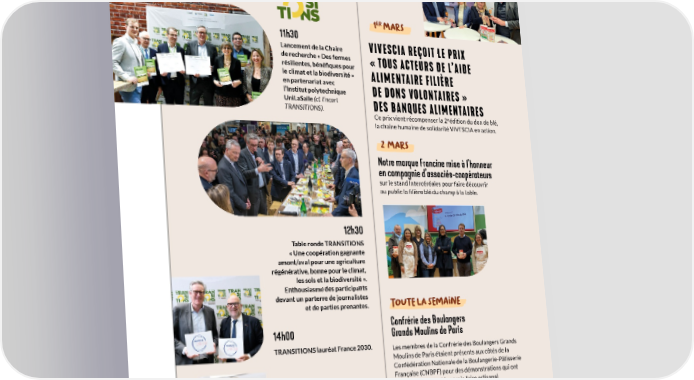 R SIA 2024 u s une édition sous le signe de TRANSITIONS, riche en événements, m en échanges et en récompenses ! o 26 février o Z JOURNÉE TRANSITIONS er 1 maRs 11h30 VIVESCIA REÇOIT LE PRIX Lancement de la Chaire de recherche « Des fermes « TOUS ACTEURS DE L’AIDE résilientes, bénéfiques pour le climat et la biodiversité » ALIMENTAIRE FILIÈRE en partenariat avec l’Institut polytechnique DE DONS VOLONTAIRES » UniLaSalle (cf. Encart DES BANQUES ALIMENTAIRES TRANSITIONS). e Ce prix vient récompenser la 2 édition du don de blé, la chaîne humaine de solidarité VIVESCIA en action. 2 maRs Notre marque Francine mise à l’honneur en compagnie d’associés-coopérateurs sur le stand Intercéréales pour faire découvrir au public la filière blé du champ à la table. 12h30 Table ronde TRANSITIONS « Une coopération gagnante amont/aval pour une agriculture régénérative, bonne pour le climat, les sols et la biodiversité ». Enthousiasme des participants devant un parterre de journalistes toute la semaIne et de parties prenantes. 14h00 Confrérie des Boulangers Grands Moulins de Paris TRANSITIONS lauréat France 2030. Les membres de la Confrérie des Boulangers Grands Moulins de Paris étaient présents aux côtés de la Confédération Nationale de la Boulangerie-Pâtisserie 16h00 Française (CNBPF) pour des démonstrations qui ont mis en lumière tout le savoir-faire artisanal Participation de VIVESCIA du métier de boulanger auprès du grand public. à la conférence INRAE : « Transitions des systèmes agricoles et alimentaires dans les territoires ». POUR EN SAVOIR PLUS, RENDEZ-VOUS SUR LINKEDIN 46
