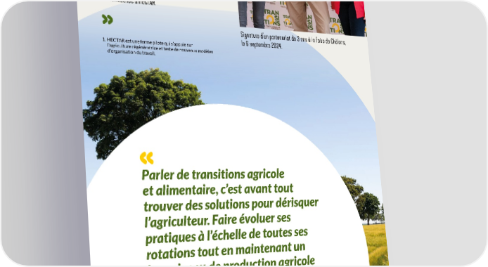 ACCOMPAGNER LA PÉDAGOGIE AVEC HECTAR1 Nous souhaitons, aux côtés d’un des premiers groupes coopératifs céréaliers français, contribuer à la pédagogie des enjeux de décarbonation et de biodiversité au sein des filières végétales et céréalières. HECTAR poursuit ainsi son rôle d’accélérateur de la transition sociale et économique de l’agriculture régénératrice. AUDREY BOUROLLEAU Co-fondatrice d’HECTAR Signature d’un partenariat de 3 ans à la Foire de Châlons, le 6 septembre 2024. 1. HECT AR est une ferme pilote qui s’appuie sur l’agriculture régénératrice et teste de nouveaux modèles d’organisation du travail. Parler de transitions agricole et alimentaire, c’est avant tout trouver des solutions pour dérisquer l’agriculteur. Faire évoluer ses pratiques à l’échelle de toutes ses rotations tout en maintenant un bon niveau de production agricole doit passer par une double sécurité : économique et technique. En un an, nous avons grandi, appris, gravi des marches avec chaque maillon du programme. Une énergie collective est là, la confiance aussi ! VALÉRIE FRAPIER Directrice RSE Groupe et du programme TRANSITIONS