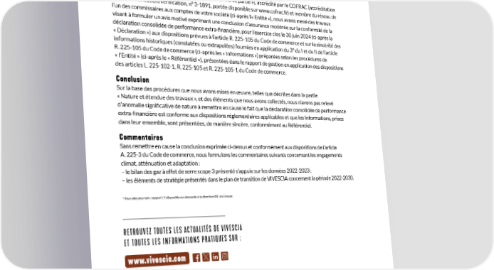 RAPPORT* DE L’UN DES COMMISSAIRES AUX COMPTES, DÉSIGNÉ ORGANISME TIERS INDÉPENDANT POUR LA VÉRIFICATION DE LA DÉCLARATION CONSOLIDÉE DE PERFORMANCE EXTRA-FINANCIÈRE En notre qualité d’organisme tiers indépendant (« tierce partie »), accrédité par le COFRAC (accréditation COFRAC validation/vérification, n° 3-1891, portée disponible sur www.cofrac.fr) et membre du réseau de l’un des commissaires aux comptes de votre société (ci-après l’« Entité »), nous avons mené des travaux visant à formuler un avis motivé exprimant une conclusion d’assurance modérée sur la conformité de la déclaration consolidée de performance extra-financière, pour l’exercice clos le 30 juin 2024 (ci-après la « Déclaration ») aux dispositions prévues à l’article R. 225-105 du Code de commerce et sur la sincérité des informations historiques (constatées ou extrapolées) fournies en application du 3° du I et du II de l’article R. 225-105 du Code de commerce (ci-après les « Informations ») préparées selon les procédures de « l’Entité » (ci-après le « Référentiel »), présentées dans le rapport de gestion en application des dispositions des articles L. 225-102-1, R. 225-105 et R. 225-105-1 du Code de commerce. Conclusion Sur la base des procédures que nous avons mises en œuvre, telles que décrites dans la partie « Nature et étendue des travaux », et des éléments que nous avons collectés, nous n’avons pas relevé d’anomalie significative de nature à remettre en cause le fait que la déclaration consolidée de performance extra-financière est conforme aux dispositions réglementaires applicables et que les Informations, prises dans leur ensemble, sont présentées, de manière sincère, conformément au Référentiel. Commentaires Sans remettre en cause la conclusion exprimée ci-dessus et conformément aux dispositions de l’article A. 225-3 du Code de commerce, nous formulons les commentaires suivants concernant les engagements climat, atténuation et adaptation : – le bilan des gaz à effet de serre scope 3 présenté s’appuie sur les données 2022-2023 ; – les éléments de stratégie présentés dans le plan de transition de VIVESCIA concernent la période 2022-2030. * Pour aller plus loin : rapport EY disponible sur demande à la direction RSE du Groupe. RETROUVEZ TOUTES LES ACTUALITÉS DE VIVESCIA ET TOUTES LES INFORMATIONS PRATIQUES SUR : www.vivescia.com VIVESCIA, avec les agriculteurs, ses partenaires, Courrier : VIVESCIA – 2, rue Clément Ader, 51100 Reims ses clients industriels, acteurs des filières grandes cultures, E-mail : [email protected] se mobilise pour relever le défi du changement climatique et des transitions agricoles et alimentaires. Siège social à Reims • 2 rue Clément Ader, 51100 Reims • +33 (0)3 26 78 62 00 • Conception graphique : Anthony Texeira - DotStudio • Conception éditoriale et rédaction : Corine Delahaye, Valérie Desprets - Sapristi Factory, direction de la communication VIVESCIA • Crédits photo : Ballade Studio, Bertrand Boissimon, Axel Cœuret, Guillaume Czerw, Jacques Dieppedalle, Claire Jachymiak, Clément Lemaire, Guillaume Ombreux, Benoît Pelletier, Léo-Paul Ridet, Stéphanie Tétu - La Company, Visu Communication, La Coopération Agricole, Malteurop, Grands Moulins de Paris, Francine, Campaillette, Délifrance, Kalizea, NEALIA, VIVESCIA • Imprimeur : Galaxy. Ce document est imprimé sur un papier issu de forêts gérées durablement et certifiées PEFC. Une publication de la direction de la communication du Groupe VIVESCIA • Novembre 2024 74