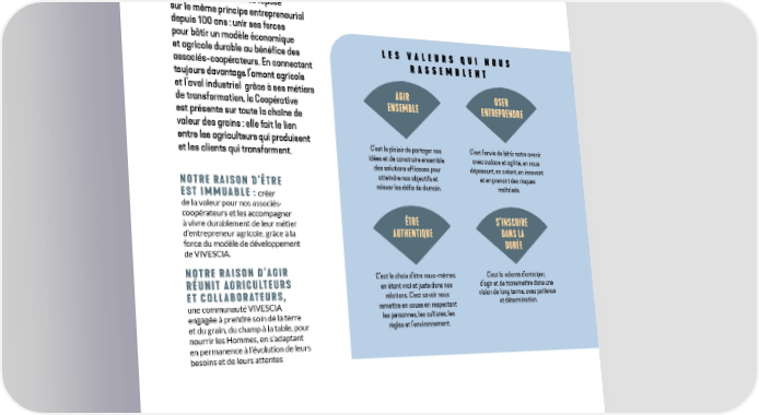 Un modèle d’affaires et coopératif entrePReneurIal Notre modèle d’affaires repose sur le même principe entrepreneurial depuis 100 ans : unir ses forces pour bâtir un modèle économique LES VALEURS QUI NOUS et agricole durable au bénéfice des RASSEMBLENT associés-coopérateurs. En connectant toujours davantage l’amont agricole et l’aval industriel grâce à ses métiers AGIR OSER de transformation, la Coopérative ENSEMBLE ENTREPRENDRE est présente sur toute la chaîne de valeur des grains : elle fait le lien entre les agriculteurs qui produisent C’est le plaisir de partager nos C’est l’envie de bâtir notre avenir et les clients qui transforment. idées et de construire ensemble avec audace et agilité, en nous des solutions efficaces pour dépassant, en créant, en innovant NOTRE RAISON D’ÊTRE atteindre nos objectifs et et en prenant des risques relever les défis de demain. maîtrisés. créer EST IMMUABLE : de la valeur pour nos associés- coopérateurs et les accompagner ÊTRE S’INSCRIRE à vivre durablement de leur métier d’entrepreneur agricole, grâce à la AUTHENTIQUE DANS LA force du modèle de développement DURÉE de VIVESCIA. NOTRE RAISON D’AGIR C’est le choix d’être nous-mêmes C’est la volonté d’anticiper, RÉUNIT AGRICULTEURS en étant vrai et juste dans nos d’agir et de transmettre dans une ET COLLABORATEURS, relations. C’est savoir nous vision de long terme, avec patience une communauté VIVESCIA remettre en cause en respectant et détermination. engagée à prendre soin de la terre les personnes, les cultures, les règles et l’environnement. et du grain, du champ à la table, pour nourrir les Hommes, en s’adaptant en permanence à l’évolution de leurs besoins et de leurs attentes VIVESCIA, PRÉSENT SUR TOUTE LA CHAÎNE DE VALEUR, EN VALORISANT TOUT LE POTENTIEL DU GRAIN,DU CHAMP À LA TABLE, EN FRANCE ET SUR LES QUATRE CONTINENTS 58
