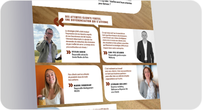 Ce sonteux qui en parlent Ils sont acteurs de LINK au quotidien. Comment déclinent-ils la stratégie LINK au sein de leurs activités ? Qu’est-ce que LINK apporte dans chacune de leurs le mieux entreprises ? Quelles sont leurs attentes pour demain ? DES ATTENTES CLIENTS FORTES, UNE DIFFÉRENCIATION QUI S’AFFIRME La stratégie LINK a fait évoluer Ce qui nous sert sur le marché en l’expression de nos besoins auprès tant que fournisseurs des brasseurs, de nos fournisseurs de blé tendre. c’est d’avoir une vision stratégique Viennent désormais s’y ajouter les claire vis-à-vis de nos clients avec demandes de réduction des émissions des résultats et des actions concrètes de gaz à effet de serre. Le temps de la qui illustrent la stratégie LINK et son procrastination est révolu ! impact dans notre entreprise. SYLVAIN JAOUEN JEAN-YVES DÉJARDIN Responsable achats blé Responsable grands comptes Grands Moulins de Paris Malteurop C’est vraiment un travail avec nos clients. Cela nous positionne Nos clients sont en attente en tant que business partners de produits issus de maïs pour aller bien au-delà de simples bas carbone. négociations sur le prix. MARINE FOUQUERANT STÉPHANIE BRILLOUET Responsable développement Directrice marketing KALIZEA Délifrance au Royaume-Uni et en Irlande Cela apporte quelque chose de très positif dans la relation avec les fournisseurs et les clients, qui sont très sensibles aux enjeux de cette démarche. C’est un avantage concurrentiel non négligeable ! Par ailleurs, les collaborateurs cherchent des entreprises engagées et des métiers qui ont du sens. Avoir une démarche RSE forte est FLASHEZ LE QR CODE important et doit être valorisé auprès d’eux et auprès des POUR EN SAVOIR PLUS futurs talents que l’on souhaite recruter. SUR LINK, LA DÉMARCHE DÉVELOPPEMENT CÉDRIC LETISSIER DURABLE DE VIVESCIA Directeur développement des activités NEALIA 40
