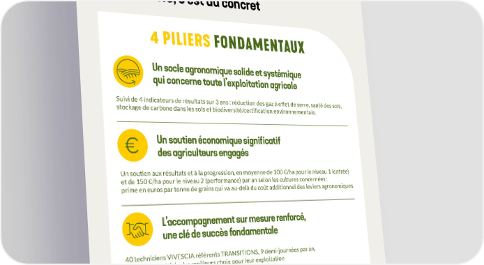 er Le 1 programme à impact à grande échelle en France et en Europe Modèle de coopération, TRANSITIONS est une démarche de progrès collective. Novateur dans son approche agronomique ET économique, il propose un accompagnement global à l’échelle de toute l’exploitation. Son objectif ? Accompagner, à l’horizon 2026, quelque 1 000 agriculteurs des territoires du nord-est de la France vers une agriculture plus résiliente, bas carbone et favorable aux sols et à la biodiversité. Parce qu’aucun acteur ne peut en porter seul les risques, VIVESCIA mobilise les agriculteurs-coopérateurs de son territoire, ses clients et entreprises de VIVESCIA Industries, et de nombreux partenaires institutionnels et techniques. Ce collectif uni, cette coalition engagée partage une ambition commune, celle de faire progresser les pratiques agricoles vers une agriculture régénérative, bonne pour la planète, le climat et la biodiversité. TRANSITIONS, c’est du concret 4 PILIERS FONDAMENTAUX Un socle agronomique solide et systémique qui concerne toute l’exploitation agricole Suivi de 4 indicateurs de résultats sur 3 ans : réduction des gaz à effet de serre, santé des sols, stockage de carbone dans les sols et biodiversité/certification environnementale. Un soutien économique significatif des agriculteurs engagés Un soutien aux résultats et à la progression, en moyenne de 100 €/ha pour le niveau 1 (entrée) et de 150 €/ha pour le niveau 2 (performance) par an selon les cultures concernées : prime en euros par tonne de grains qui va au-delà du coût additionnel des leviers agronomiques. L’accompagnement sur mesure renforcé, une clé de succès fondamentale 40 techniciens VIVESCIA référents TRANSITIONS, 9 demi-journées par an, pour aider les à faire les meilleurs choix pour leur exploitation agricole (formation collective et individuelle). La numérisation et la robustesse des données, pierre angulaire du programme RAPPORTS CLIENTS ANNUELS Amélioration des pratiques PENDANT 3 ANS Valorisation des récoltes