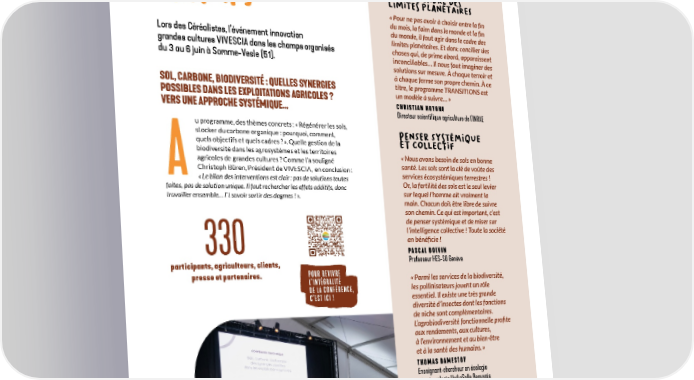 Conférence moRceaux scientifique choisis... dans les Voir loin mais dans le cadre des champS limites pLanétaireS « Pour ne pas avoir à choisir entre la fin du mois, la faim dans le monde et la fin Lors des Céréalistes, l’événement innovation du monde, il faut agir dans le cadre des limites planétaires. Et donc concilier des grandes cultures VIVESCIA dans les champs organisés choses qui, de prime abord, apparaissent du 3 au 6 juin à Somme-Vesle (51). inconciliables… Il nous faut imaginer des solutions sur mesure. À chaque terroir et à chaque ferme son propre chemin. À ce SOL, CARBONE, BIODIVERSITÉ : QUELLES SYNERGIES titre, le programme TRANSITIONS est POSSIBLES DANS LES EXPLOITATIONS AGRICOLES ? un modèle à suivre… » VERS UNE APPROCHE SYSTÉMIQUE... CHRISTIAN HUYGHE Directeur scientifique agriculture de l’INRAE u programme, des thèmes concrets : « Régénérer les sols, PenseR sysTémique stocker du carbone organique : pourquoi, comment, et collectif quels objectifs et quels cadres ? ». Quelle gestion de la biodiversité dans les agrosystèmes et les territoires « Nous avons besoin de sols en bonne agricoles de grandes cultures ? Comme l’a souligné santé. Les sols sont la clé de voûte des AChristoph Büren, Président de VIVESCIA, en conclusion : services écosystémiques terrestres ! « Le bilan des interventions est clair : pas de solutions toutes Or, la fertilité des sols est le seul levier faites, pas de solution unique. Il faut rechercher les effets additifs, donc travailler ensemble… Et savoir sortir des dogmes ! ». sur lequel l’homme ait vraiment la main. Chacun doit être libre de suivre son chemin. Ce qui est important, c’est de penser systémique et de miser sur l’intelligence collective ! Toute la société en bénéficie ! 330 PASCAL BOIVIN participants, agriculteurs, clients, Professeur HES-SO Genève presse et partenaires. POUR REVIVRE « Parmi les services de la biodiversité, L’INTÉGRALITÉ DE LA CONFÉRENCE, les pollinisateurs jouent un rôle C’EST ICI ! essentiel. Il existe une très grande diversité d’insectes dont les fonctions de niche sont complémentaires. L’agrobiodiversité fonctionnelle profite aux rendements, aux cultures, à l’environnement et au bien-être et à la santé des humains. » THOMAS DAMESTOY Enseignant-chercheur en écologie et entomologie UniLaSalle Beauvais «La synergie entre biodiversité et maintien des rendements est claire. Mais ce qui n’est pas mesuré ne peut être amélioré...» MICHEL-PIERRE FAUCON Directeur délégué à la recherche UniLaSalle Beauvais, enseignant-chercheur en écologie végétale et agroécologie 22