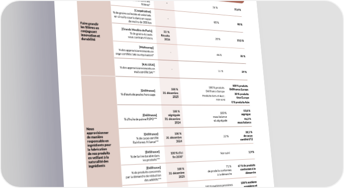 Pour aller plus loin NOS LIENS AVEC LES FILIÈRES ET TERRITOIRES DES GRAINS, DES FILIÈRES ENGAGEMENTS KPIS OBJECTIFS AU 30 JUIN 2023 AU 30 JUIN 2024 [Coopérative] % de grains sous contrats - 36 % 35,4 % filières* [Coopérative] % de grains collectés et valorisés - 80 % 80 % en circuits courts dans un rayon de moins de 300 km Faire grandir [Grands Moulins de Paris] 33 % les filières en conjuguant % de grains écrasés Récolte 20 % 23,5 % innovation et sous contrats filières 2026 durabilité [Malteurop] % des approvisionnements en - 44 % 35 % orge certifiée SAI ou équivalent* [KALIZEA] % des approvisionnements en - 55 % 59 % maïs certifié SAI** 100 % produits 100 % produits 100 % Délifrance Europe Délifrance Europe [Délifrance] 31 décembre 30 % produits % d’œufs de poules hors cage 2025 Produits tiers et Asie : non suivi tiers Europe 0 % produits Asie 100 % 53,8 % 100 % ségrégué [Délifrance] ségréguée mass balance % d’huile de palme RSPO*** 31 décembre et ségréguée 46,2 % 2024 mass balance Nous approvisionner de manière [Délifrance] 100 % 38,5 % responsable en % de cacao certifié 31 décembre 22 % de cacao ingrédients pour Rainforest Alliance*** 2024 certifié UTZ la fabrication de nos produits [Délifrance] 100 % d’ici en veillant à la % de farine durable dans fin 2030* Non suivi 5,9 % naturalité des les produits*** ingrédients [Délifrance] 100 % 71 % % de produits concernés 67 % de produits par la démarche de réduction 31 décembre de produits conformes conformes à la 2025 à la démarche des additifs*** démarche 100 % matières premières 100 % matières 100 % et recettes de mon moulin premières et Recettes de mon [Grands Moulins de Paris] 31 décembre 83 % Moulin % d’œufs de poules hors cage 2025 produits surgelés 90 % produits surgelés * Contrats filières : contrats clients intégrant des cahiers des charges/des spécifications/des exigences particulier(e)s relatif(ve)s aux enjeux RSE. ** SAI : référentiel international standardisé d’évaluation des pratiques agricoles au regard d’exigences en matière d’agriculture durable, porté par la Sustainable Agriculture Initiative (organisation rassemblant des acteurs des chaînes de valeur agroalimentaires). *** Indicateur qui concerne les produits fabriqués par Délifrance. Les produits sous-traités ne sont pas intégrés dans le périmètre aujourd’hui. Délifrance collabore avec ses fournisseurs pour atteindre le même niveau d’exigence. collabore avec ses fournisseurs. RAPPORT INTÉGRÉ 2023-2024 65