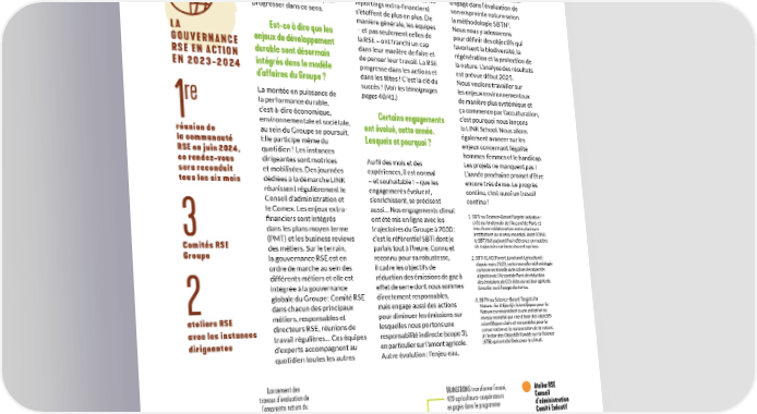 LINK en action donnent du sens à nos actions fonctions mobilisées autour de essentiel dans les champs et les renforcent. En résumé, ces enjeux. Des communautés comme sur nos sites, est on avance ! Ces progrès sont structurées autour des grands désormais intégré à notre le fruit de la mobilisation de projets transversaux du stratégie LINK et devient un Groupe (référents climat sur toutes et de tous, dans toutes engagement. Des travaux la stratégie de décarbonation, les entités du Groupe, et je les commenceront en 2025. relais pour le déploiement de en remercie ! Cet engagement Au printemps 2024, le collectif est sans doute ma plus la Charte environnementale Groupe VIVESCIA s’est aussi grande satisfaction car c’est la du Groupe, relais pour tous les engagé dans l’évaluation de condition indispensable pour reportings extra-financiers) son empreinte nature selon s’étoffent de plus en plus. De 3 progresser dans ce sens. ve la méthodologie SBTN . manière générale, les équipes Nous nous y adosserons – et pas seulement celles de Est-ce à dire que les pour définir des objectifs qui LA la RSE – ont franchi un cap favorisent la biodiversité, la enjeux de développement éduction dans leur manière de faire et régénération et la protection de GOUVERNANCE durable sont désormais de penser leur travail. La RSE la nature. L’analyse des résultats RSE EN ACTION ésilience EN 2023-2024 intégrés dans le modèle progresse dans les actions et est prévue début 2025. d’affaires du Groupe ? dans les têtes ! C’est la clé du Nous voulons travailler sur succès ! (Voir les témoignages les enjeux environnementaux pages 40/41.) La montée en puissance de de manière plus systémique et re la performance durable, ça commence par l’acculturation, c’est-à-dire économique, Certains engagements c’est pourquoi nous lançons 1 environnementale et sociétale, ont évolué, cette année. la LINK School. Nous allons réunion de au sein du Groupe se poursuit. Lesquels et pourquoi ? également avancer sur les la communauté Elle participe même du enjeux concernant l’égalité RSE en juin 2024, quotidien ! Les instances hommes-femmes et le handicap. dirigeantes sont motrices Les projets ne manquent pas ! ce rendez-vous Au fil des mois et des sera reconduit et mobilisées. Des journées expériences, il est normal L’année prochaine promet d’être tous les six mois dédiées à la démarche LINK – et souhaitable ! – que les encore très dense. Le progrès réunissent régulièrement le engagements évoluent, continu, c’est aussi un travail Conseil d’administration et s’enrichissent, se précisent continu ! le Comex. Les enjeux extra- aussi… Nos engagements climat 1. S BTi ou Science-Based Targets initiative : financiers sont intégrés ont été mis en ligne avec les créé au lendemain de l’Accord de Paris et dans les plans moyen terme issu d’une collaboration entre plusieurs 3 trajectoires du Groupe à 2030 : institutions au niveau mondial, dont l’ONU, (PMT) et les business reviews Comités RSE c’est le référentiel SBTi dont je le SBTi fait aujourd’hui référence en matière des métiers. Sur le terrain, parlais tout à l’heure. Connu et de trajectoire carbone des entreprises. Groupe la gouvernance RSE est en reconnu pour sa robustesse, 2. SBTi FLAG (Forest, Land and Agriculture) : ordre de marche au sein des depuis mars 2023, cette nouvelle méthodologie il cadre les objectifs de carbone sectorielle aide à fixer les objectifs différents métiers et elle est alignés avec l’Accord de Paris de réduction réduction des émissions de gaz à intégrée à la gouvernance effet de serre dont nous sommes des émissions de CO2 liées au secteur agricole, forestier ou à l’usage des terres. globale du Groupe : Comité RSE directement responsables, 2 dans chacun des principaux mais engage aussi des actions 3. SBTN ou Science-Based Targets for Nature : les Objectifs Scientifiques pour la ateliers RSE métiers, responsables et pour diminuer les émissions sur Nature correspondent à une initiative au directeurs RSE, réunions de lesquelles nous portons une niveau mondial qui vise à fixer des objectifs avec les instances scientifiques clairs et mesurables pour la travail régulières… Ces équipes responsabilité indirecte (scope 3), conservation et la restauration de la nature, dirigeantes à l’instar des Objectifs Fondés sur la Science d’experts accompagnent au en particulier sur l’amont agricole. (STB) qui ont été fixés pour le climat. quotidien toutes les autres Autre évolution : l’enjeu eau, Lancement des travaux d’évaluation de TRANSITIONS transforme l’essai, Atelier RSE l’empreinte nature du 420 agriculteurs-coopérateurs Conseil Groupe VIVESCIA engagés dans le programme d’administration Comité Exécutif FÉV. AVRIL SEPT. Lancement du diagnostic Comité biodiversité pour tous les RSE Groupe associés-coopérateurs VIVESCIA 2024 Lancement Certification Validation de la démarche de de la chaire de recherche MAI JUIN des objectifs responsabilité sociétale de la VIVESCIA/UniLaSalle climat 2030 marque Francine par la SBTi Renouvellement pour trois ans du partenariat avec les Banques Alimentaires RAPPORT INTÉGRÉ 2023-2024 29