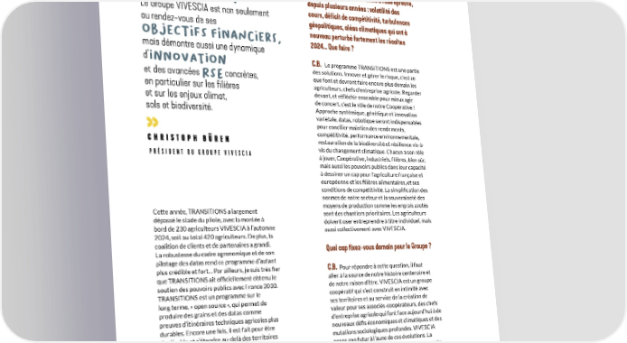Rencontre avec Fierté Le monde agricole est soumis à rude épreuve, depuis plusieurs années : volatilité des collective ! Le Groupe VIVESCIA est non seulement cours, déficit de compétitivité, turbulences au rendez-vous de ses géopolitiques, aléas climatiques qui ont à OBjectifs financierS, nouveau perturbé fortement les récoltes mais démontre aussi une dynamique 2024… Que faire ? d’InnovatiOn C.B. Le programme TRANSITIONS est une partie et des avancées concrètes, des solutions. Innover et gérer le risque, c’est ce rse que font et devront faire encore plus demain les en particulier sur les filières agriculteurs, chefs d’entreprise agricole. Regarder et sur les enjeux climat, devant, et réfléchir ensemble pour mieux agir de concert, c’est le rôle de notre Coopérative ! sols et biodiversité. Approche systémique, génétique et innovation variétale, datas, robotique seront indispensables pour concilier maintien des rendements, compétitivité, performance environnementale, CHRISTOPH BÜREN restauration de la biodiversité et résilience vis-à- PRÉSIDENT DU GROUPE VIVESCIA vis du changement climatique. Chacun a son rôle à jouer, Coopérative, industriels, filières, bien sûr, mais aussi les pouvoirs publics dans leur capacité à dessiner un cap pour l’agriculture française et européenne et les filières alimentaires, et ses conditions de compétitivité. La simplification des normes de notre secteur et la souveraineté des moyens de production comme les engrais azotés Cette année, TRANSITIONS a largement sont des chantiers prioritaires. Les agriculteurs dépassé le stade du pilote, avec la montée à doivent oser entreprendre à titre individuel, mais bord de 230 agriculteurs VIVESCIA à l’automne aussi collectivement avec VIVESCIA. 2024, soit au total 420 agriculteurs. De plus, la coalition de clients et de partenaires a grandi. Quel cap fixez-vous demain pour le Groupe ? La robustesse du cadre agronomique et de son pilotage des datas rend ce programme d’autant plus crédible et fort… Par ailleurs, je suis très fier C.B. Pour répondre à cette question, il faut que TRANSITIONS ait officiellement obtenu le aller à la source de notre histoire centenaire et soutien des pouvoirs publics avec France 2030. de notre raison d’être. VIVESCIA est un groupe TRANSITIONS est un programme sur le coopératif qui s’est construit en intimité avec long terme, « open source », qui permet de ses territoires et au service de la création de produire des grains et des datas comme valeur pour ses associés-coopérateurs, des chefs preuves d’itinéraires techniques agricoles plus d’entreprise agricole qui font face aujourd’hui à de durables. Encore une fois, il est fait pour être nouveaux défis économiques et climatiques et des duplicable et s’étendre au-delà des territoires mutations sociologiques profondes. VIVESCIA coopératifs de VIVESCIA… Il y a une nécessité pense son futur à l’aune de ces évolutions. La absolue de construire des langages communs puissante dynamique de transformation engagée sur l’agriculture régénérative et des consensus va se poursuivre, autour de quelques lignes sur les modèles économiques. VIVESCIA, avec directrices fondamentales comme les filières, les TRANSITIONS, peut et doit y apporter sa transitions agroécologiques, les partenariats et la contribution. mutualisation. Les équipes sont au travail ! RAPPORT INTÉGRÉ 2023-2024 15
