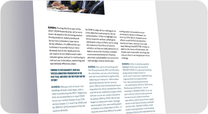 SHAREHOLDERS’ NEWSLETTER VIVESCIA INDUSTRIES 2022-2023 OLIVIER H.: During this 昀椀rst part of the by GMP, to align all our colleagues on cutting water consumption at our 2023-2024 昀椀nancial year, we’ve seen clear objectives and projects, like de- viennoiserie factory in Romans-sur- lower demand in the brewing market. carbonisation. I’d like to highlight one Isère by 25%. We’ve stepped up our Premium beers, mainly produced of our concrete actions, which gene- efforts, as all VIVESCIA Industries by our key customers, have been rated quite a buzz in Paris: we’re using businesses have, with our new road hit by in昀氀ation. It’s dif昀椀cult for our the industry’s 昀椀rst 昀氀eet of electric map: Baking Good BETTER. It helps us customers to predict future beer vehicles, so that our daily deliveries to address the issues of food waste, the demand, but in the medium term, bakers across the city have a smaller climate and responsible sourcing, and we expect to see Malteurop’s sales environmental footprint. Francine ensures they’re an integral part of our volumes grow, and we’re continuing to also took sustainability to a new level, strategy. roll out our innovation, marketing and with pledges and an action plan. operational ef昀椀ciency plans. OLIVIER M.: I’d like to mention another OLIVIER H.: Yes, we’re all working with highlight of the year, the launch of TURNING TO SUSTAINABILITY, HOW HAS the Group towards SBTi certi昀椀cation. TRANSITIONS. It’s a ground-breaking VIVESCIA INDUSTRIES PROGRESSED IN THE As a business, we use a lot of energy, programme to help farmers in PAST YEAR, AND WHAT ARE THE PLANS FOR THE and we’re committed to signi昀椀cantly north-east France start implementing FUTURE? reducing our footprint. We’ve been regenerative farming practices. working towards this for several Our main processing businesses OLIVIER M.: We put a lot of work into years. We’ve now 昀椀nished drafting en- – Grands Moulins de Paris, Délifrance, building climate road maps, with a ergy plans for all our production sites, Malteurop and Kalizea – are all 1 view to achieving the SBTi objectives and we’ve set ambitious targets which involved in TRANSITIONS. It’s an op- that we committed to in April 2023 will see us cut our carbon emissions portunity for them to help upstream to cut our carbon footprint by 25% by almost 40% by 2030. We’ve also farmers to cut carbon from their across scopes 1, 2 and 3 by 2030 and begun an important water manage- operations, and to secure their supply by 38% for GHG emissions that we ment project. Our new malting plant chains in the face of climate and biodi- control directly. in Mexico is an illustration of this – it versity risks. TRANSITIONS is a full- recycles more than 80% of its water. scale trial programme. It will produce PIERRE G.: 2023 was a milestone year solutions that can be replicated across for Grands Moulins de Paris, because ROBERT O’B.: Yes, water has emerging France and beyond, for the bene昀椀t of we rolled out our version of the as a priority that needs to be tackled our value chains and our customers. Group’s strategic framework, LINK systematically. We’ve started by 1. Created following the Paris Agreement, and a product of a collaboration between several institutions around the world, including the UN, the Science- Based Targets Initiative (SBTi) is now the benchmark in terms of companies’ carbon trajectories: https://sciencebasedtargets.org/ 10 11