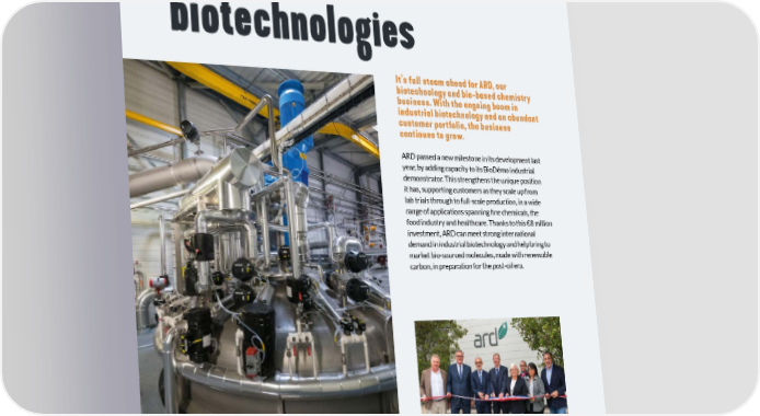 SHAREHOLDERS’ NEWSLETTER VIVESCIA INDUSTRIES 2022-2023 Industrial biotechnologies It’s full steam ahead for ARD, our biotechnology and bio-based chemistry business. With the ongoing boom in industrial biotechnology and an abundant customer portfolio, the business continues to grow. ARD passed a new milestone in its development last year, by adding capacity to its BioDémo industrial demonstrator. This strengthens the unique position it has, supporting customers as they scale up from lab trials through to full-scale production, in a wide range of applications spanning 昀椀ne chemicals, the food industry and healthcare. Thanks to this €8 million investment, ARD can meet strong international demand in industrial biotechnology and help bring to market bio-sourced molecules, made with renewable carbon, in preparation for the post-oil era. From left to right: Olivier de Bohan, President of Cristal Union; Christoph Launch of Büren, President of VIVESCIA; Henri Prévost, Prefect of the Marne Department; Philippe Aubry, Managing director of ARD; Catherine BioDémo 2 Vautrin, President of the greater Reims region; Olivier Miaux, Managing director of VIVESCIA Industries; Anne-Sophie Romagny, Senator of the Marne Department; Xavier Albertini, Deputy of the Marne Department 18 19