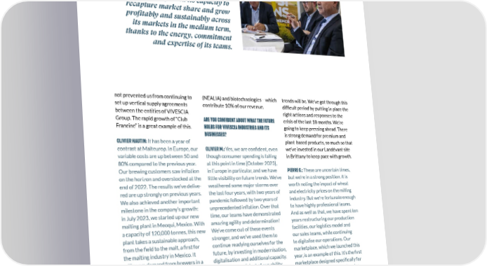 VIVESCIA INDUSTRIES 2022-2023 OLIVIER MIAUX Managing Director of VIVESCIA Industries VIVESCIA Industries has displayed its resilience and confirmed its capacity to recapture market share and grow profitably and sustainably across its markets in the medium term, thanks to the energy, commitment and expertise of its teams. not prevented us from continuing to (NEALIA) and biotechnologies – which trends will be. We’ve got through this set up vertical supply agreements contribute 10% of our revenue. dif昀椀cult period by putting in place the between the entities of VIVESCIA right actions and responses to the Group. The rapid growth of “Club ARE YOU CONFIDENT ABOUT WHAT THE FUTURE crisis of the last 18 months. We’re Francine” is a great example of this. HOLDS FOR VIVESCIA INDUSTRIES AND ITS going to keep pressing ahead. There BUSINESSES? is strong demand for premium and OLIVIER HAUTIN: It has been a year of plant-based products, so much so that OLIVIER M.: Yes, we are con昀椀dent, even contrast at Malteurop. In Europe, our we’ve invested in our Landévant site though consumer spending is falling variable costs are up between 50 and in Brittany to keep pace with growth. at this point in time [October 2023], 80% compared to the previous year. in Europe in particular, and we have Our brewing customers saw in昀氀ation PIERRE G.: These are uncertain times, little visibility on future trends. We’ve on the horizon and overstocked at the but we’re in a strong position. It is weathered some major storms over end of 2022. The results we’ve delive- worth noting the impact of wheat the last four years, with two years of red are up strongly on previous years. and electricity prices on the milling We also achieved another important pandemic followed by two years of industry. But we’re fortunate enough unprecedented in昀氀ation. Over that milestone in the company’s growth: to have highly professional teams. time, our teams have demonstrated in July 2023, we started up our new And as well as that, we have spent ten amazing agility and determination! malting plant in Meoqui, Mexico. With years restructuring our production We’ve come out of these events a capacity of 120,000 tonnes, this new facilities, our logistics model and stronger, and we’ve used them to plant takes a sustainable approach, our sales teams, while continuing continue readying ourselves for the from the 昀椀eld to the malt, a 昀椀rst for to digitalise our operations. Our the malting industry in Mexico. It future, by investing in modernisation, marketplace, which we launched this digitalisation and additional capacity. will serve demand from brewers in a year, is an example of this. It’s the 昀椀rst Yes, we are con昀椀dent of our ability country where beer consumption is marketplace designed speci昀椀cally for to strengthen our positions on our rising fast but there is a shortage of artisan bakers in France. We’ve also markets and progressively continue to malt. put together an aggressive commer- improve our 昀椀nancial performance. cial plan for 2023-2024, covering all OLIVIER M.: It is important for me to our segments: food manufacturers, ROBERT O’B. : There is still a lot of un- also point out the good results of the craft bakers, retail (with Francine) and rest of our other businesses – maize certainty around consumer demand, export. and it’s dif昀椀cult to see what future processing (Kalizea), animal feed 09