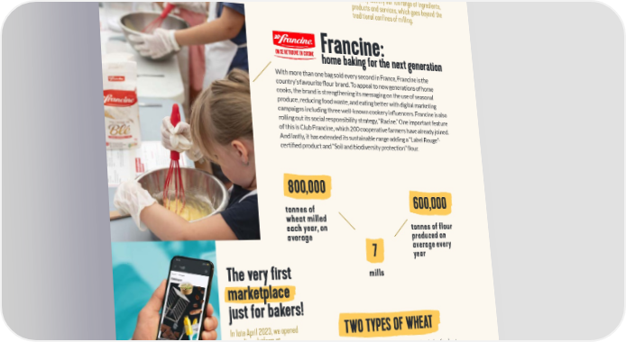 VIVESCIA INDUSTRIES 2022-2023 IS OPTIMISATION ID Ingredients The Harmonie project aims to modernise the IT systems of our Marseille, ID Ingredients is our new brand aimed at frozen Verneuil-l’Étang, Paris-Gennevilliers and Mûr-de-Bretagne sites, as well bakery manufacturers. It enables customers as those of our logistics service providers. to easily identify our full range of ingredients, products and services, which goes beyond the traditional confines of milling. Francine: home baking for the next generation With more than one bag sold every second in France, Francine is the country’s favourite 昀氀our brand. To appeal to new generations of home cooks, the brand is strengthening its messaging on the use of seasonal produce, reducing food waste, and eating better with digital marketing campaigns including three well-known cookery in昀氀uencers. Francine is also rolling out its social responsibility strategy, “Racine.” One important feature of this is Club Francine, which 200 cooperative farmers have already joined. And lastly, it has extended its sustainable range adding a “Label Rouge”- certi昀椀ed product and “Soil and biodiversity protection” 昀氀our. 800,000 600,000 tonnes of wheat milled each year, on tonnes of flour average produced on 7 average every year The very first mills marketplace just for bakers! In late April 2023, we opened TWO TYPES OF WHEAT an online platform at www.grandsmoulinsdeparis.com, The new blend of soft wheat where bakers can buy the entire and durum wheat launched by Grands Moulins de Paris range along Campaillette on 1 June 2023 with products and equipment from a is a winner. It meets our customers’ expectations and carefully selected range of partners. consumers love its biscuity, nutty flavour. Everything is available in one place to make our customers’ lives easier. 15